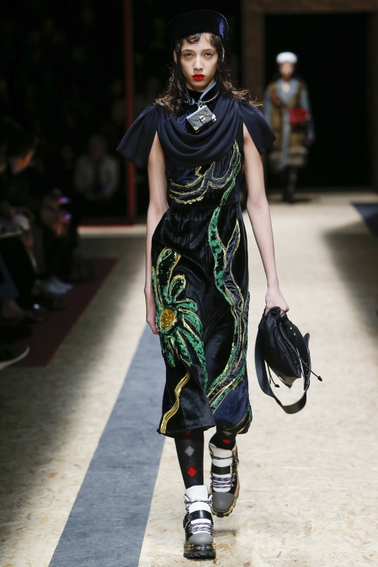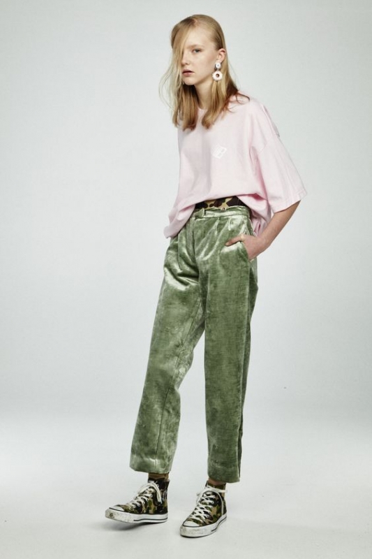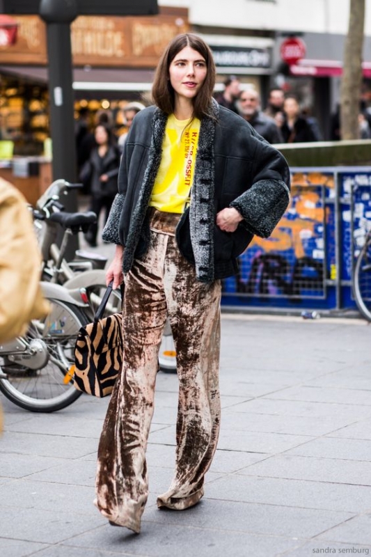 Le second, bien plus excitant, se propose de détourner le velours de son aura aristocratique en boudant le premier degré au profit de fusions stylistiques inattendues. On put ainsi voir récemment Miuccia Prada accompagner ses fourreaux en velours brodés de spectaculaires boots de montagne, quelques accros aux pièces vintage porter leurs robes glamour en mode diurne (voir ici et là) ou encore les bombers et autres vestes en jean adopter la cosyness baroque de la panne de velours (voir ici, ici, ici et là). Sans parler des audacieuses qui se mirent à traiter le pantalon en velours large comme un jean à part entière (voir ici et là).