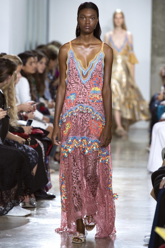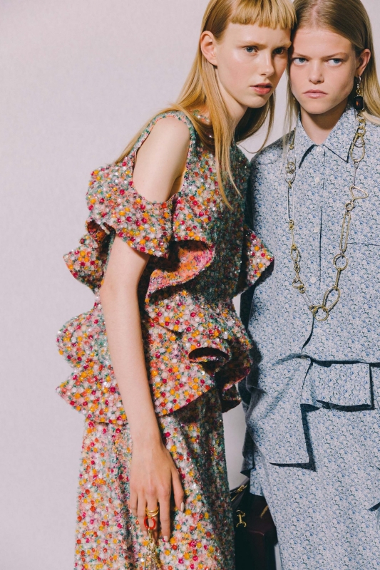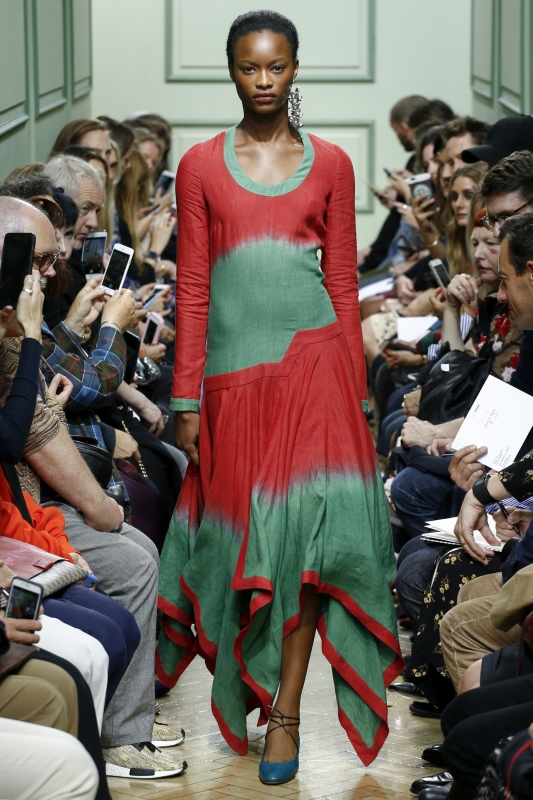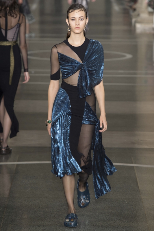 Avec ses créations poético-romantico-conceptuelles, Simone Rocha fait partie des rares designers qui osent encore aujourd'hui questionner réellement la mode. Un positionnement qui lui permet d'avancer sereinement au sein d'un univers fashion en plein questionnement, convaincue que la magie des coupes, l'inspiration toujours renouvelée et la sensualité contrariée sont bien plus porteurs que le "See Now By Now" (voir ici, ici et là). Le combo bottes cirées noires/dentelle anglaise est appelé à passer sans tarder du podium à la rue (Simone Rocha). Chouchou de la fashion week londonienne, J.W. Anderson livre une collection un brin moins piquante et conceptuelle que d'ordinaire. L'arrivée de LVMH au sein du capital de sa griffe l'aurait-il assagie ? Toujours est-il que bon nombre de robes de cette collection estivale se révèlent portables (voir ici, ici et là), voire même potentiellement désirables. L'effet esthétiquement saisissant et follement moderne du duo maxi boucles d'oreilles/cheveux ultra courts pourrait bien pousser certaines à s'emparer de la tondeuse (J.W. Anderson). On jugera de la force prescriptrice de Christopher Kane à la présence éventuelle dans les prochains mois des Crocs au sein des comptes Instagram des modeuses influentes (voir ici et là)... Nouveau DA de Mulberry, Johnny Coca semble totalement épris de l'esthétique Vetements. C'est en tout cas ce que laisse penser sa première collection, qui pourrait sans mal passer pour une version commerciale du travail de Demna Gvasalia (voir ici et là). Et curieusement, le résultat se révèle plutôt vendeur...
