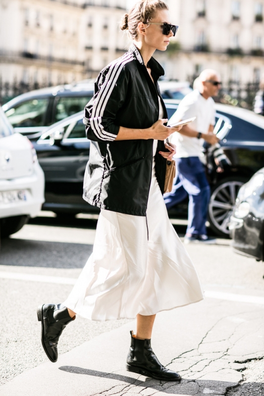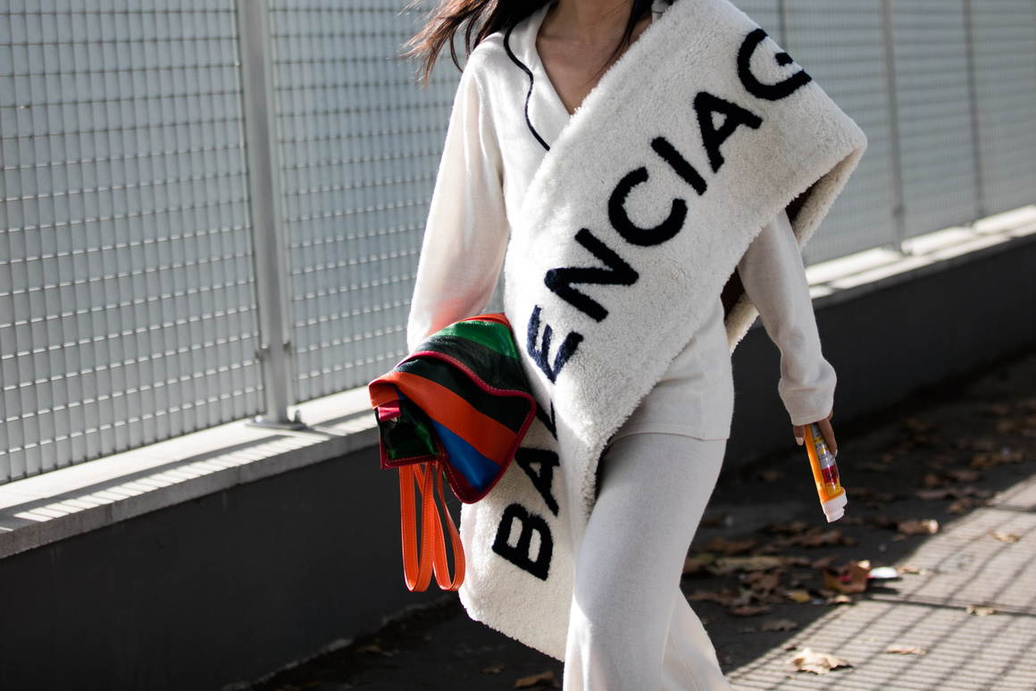 Oubliés skinny et collants traditionnels : chez Balenciaga, c'est en fuseau de lycra gainant escarpins et cuisses fuselées (voir ici, ici et là) que l'on envisage les silhouettes de l'été 2017. Et tant pis si le thermomètre dépasse de plus en plus souvent les 30°C : Demna Gvasalia a parlé... Si l'on en juge par le nombre de pièces Balenciaga aperçues ces dernières semaines aux abords des fashion weeks, force est de constater que Demna Gvasalia donne envie aux fashionistas de se frotter à son esthétique "street glam exubérante". Nul doute d'ailleurs qu'il en sera de même pour l'opus printemps/été 2017 de la griffe parisienne. Les plus audacieuses se risqueront ainsi à la cape préservatif et au K-Way petit chaperon rouge, tandis que les autres s'empareront des pièces ultra portables du vestiaire eighties de saison (voir ici, ici et là). Prions pour que bottes à bouts plats et carrés et autres poufs transportables ne descendent jamais dans la rue (voir ici et là)…