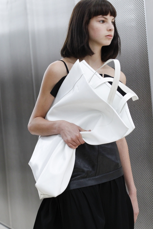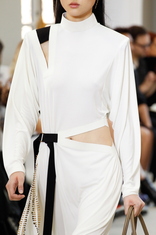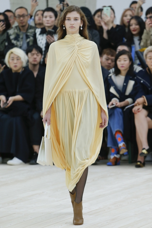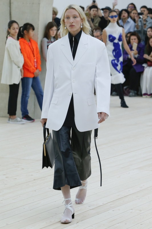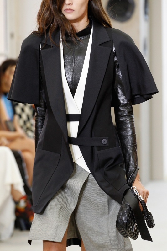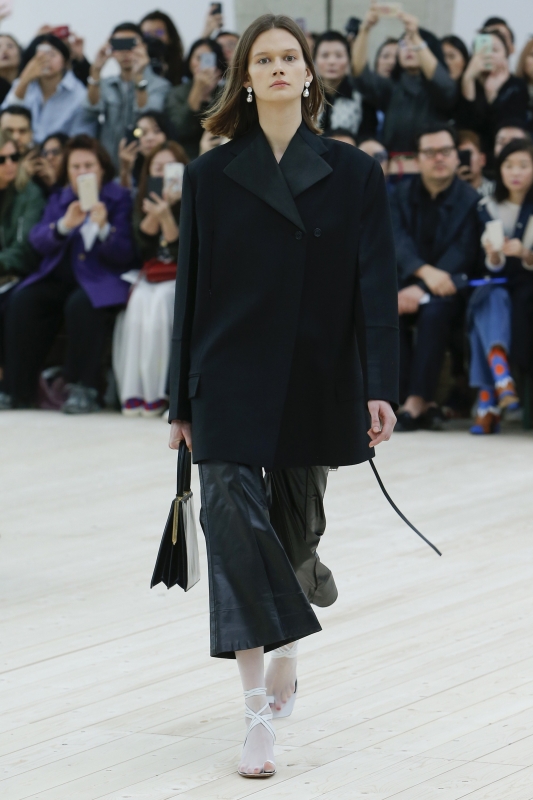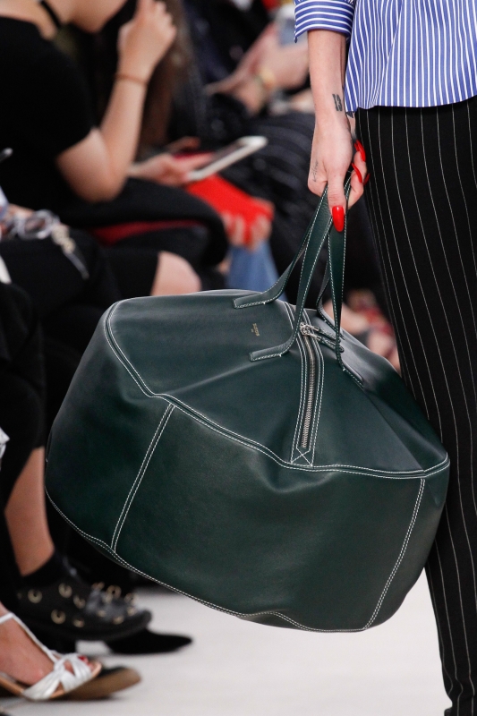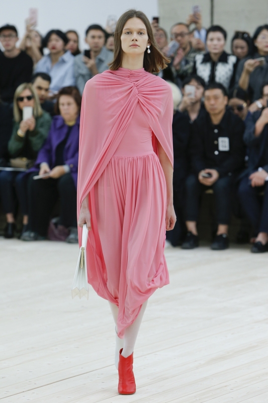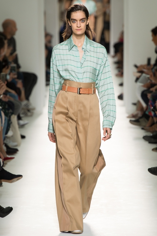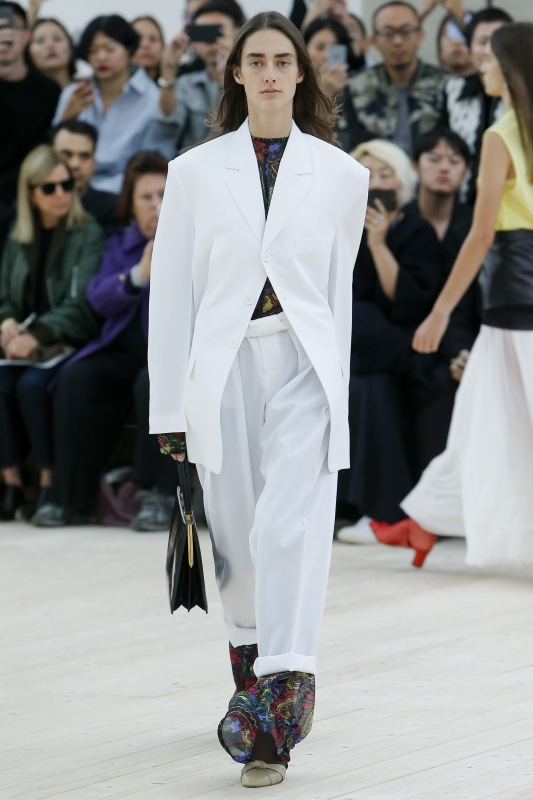 Entre maxi sac et carrure exagérée, il semblerait que Phoebe Philo ne soit pas insensible au travail de Demna Gvasalia (Balenciaga). L'incongruité du gimmick de saison consistant à glisser un pantalon en mousseline sous un ample pantalon masculin aurait d'ailleurs tendance à nous confirmer cette impression... Si l'on excepte la nouvelle silhouette tailoring de la griffe composée d'une veste trop grande et d'un pantalon large flare (voir ici et là), ce sont les robes parachutes aux plissés guimauves (voir ici et là) qui attirent le plus l'attention, tant elles semblent potentiellement évolutives. Hommage à Yves Klein.