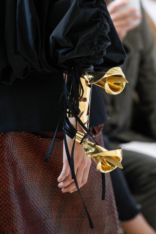 Chez Loewe, les jeux de fronces offrent de la densité à l'ampleur (voir ici et là). Les fleurs de cuir se la jouent "bijoux conceptuels" (voir ici et là).