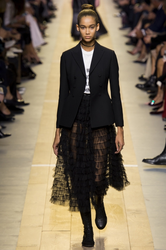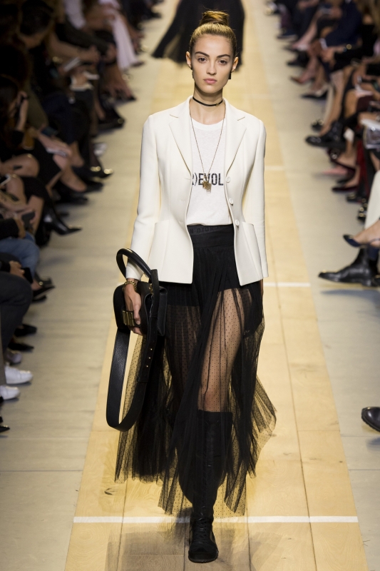 Pour sa première collection chez Dior, Maria Grazia Chiuri choisit la sécurité, au risque d'apparaître un brin ennuyante. À vrai dire, seule sa version "soft" de la veste bar mérite réellement le détour (voir ici et là). La créatrice sait comment flatter les rédactrices de mode du magazine Elle (voir ici).