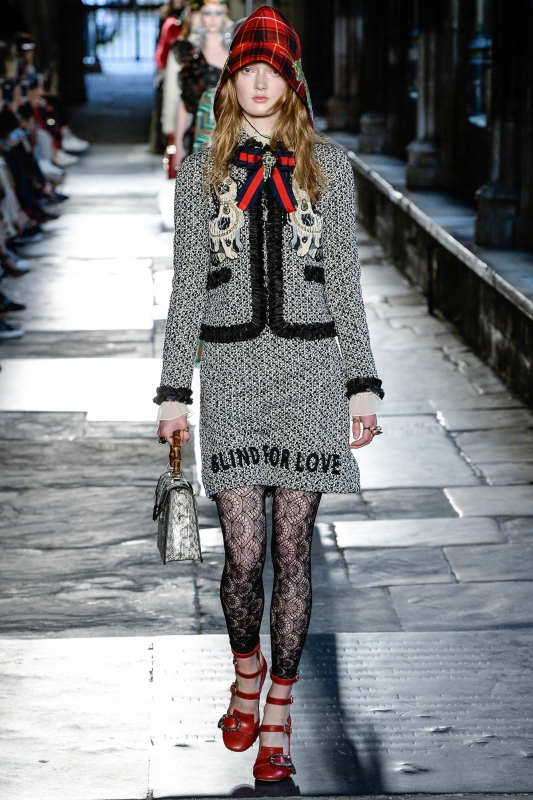 Depuis qu'il souffle ici un vent glacial s'insinuant pernicieusement dans le moindre espace laissé par un col mal relevé, le chapeau de pêcheur islandais aperçu au 32e passage du défilé Gucci Croisière 2017 hante mes rêveries pragmatico-fashion : sa forme astucieusement pensée pour épouser la chute du cou, ses longs bords protégeant élégamment le visage de l'âpreté des bourrasques torontoises, son étroit lien en cuir permettant de le maintenir discrètement mais fermement en place et ses 100% laine me font littéralement fantasmer. Des qualités malheureusement parasitées par une esthétique Guccienne bien trop alambiquée pour en faire un basique susceptible de m'accompagner au long cours. J'aurais tant aimé que, pour une fois, Michele se la joue plus "classique légèrement déjanté" que "Vacances à Balmoral sous acide"... S'il avait été décliné en bleu marine et paré d'une broderie moins kitsch, ce chapeau se serait en effet immédiatement retrouvé sur ma "vraie" wishlist.