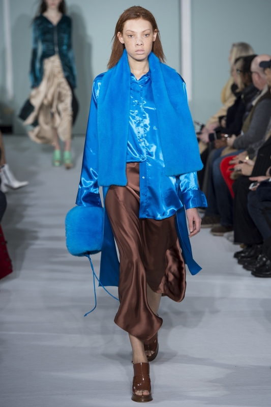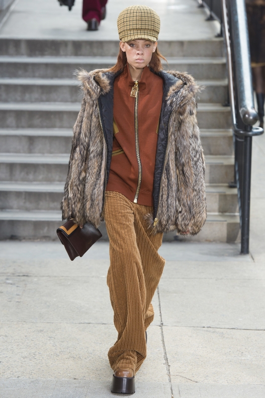 Chez Delpozo, le burkini se décline en mode prêt-à-porter (voir ici, ici et là). Après quelques années passées dans les petits papiers des acheteurs, Jack Mccollough et Lazaro Hernandez (Proenza Schouler) n'en finissent plus de décevoir. Les deux hommes ne semblent en effet plus avoir de vision claire (à supposer qu'ils n'en aient jamais eu une, ceux-ci n'ayant eu de cesse de s'inspirer de designers européens tels que Phoebe Philo et Nicolas Ghesquière), si bien que l'image de la femme PS se brouille inexorablement de saison en saison. Chez Sies Marjan, on retiendra quelques intéressantes combinaisons de teintes, à l'instar des mix bleu fumé/lila, saumon/camel/ocre et bleu azur/acajou. En voulant s'immerger un peu trop dans l'air du temps, Victoria Beckham perd en lisibilité et en personnalité (voir ici et là). Dommage... S'il ne s'avéra pas aussi enthousiasmant qu'attendu, le défilé Calvin Klein se révéla néanmoins satisfaisant et prometteur, Raf Simons ayant sagement posé les bases d'une nouvelle ère pour la griffe US, entre ADN américain, ascétisme helmut langien, tailoring et références au monde de l'art contemporain. À suivre... La maigreur extrême se vit une nouvelle fois plébiscitée sur certains shows majeurs, à l'instar de celui de Marc Jacobs (voir ici, ici et là). Clin d'oeil à l'influence du hip-hop dans la mode, le dernier opus Marc Jacobs brasse généreusement fourrure oversize, velours et peau lainée, décline à l'envi moult gimmicks sportswear et ne fait l'impasse sur aucun détail bling bling. Avec son allure étrange et son évidente photogénie, le bonnet melon imaginé par Stephen Jones pour le show Marc Jacobs risque de squatter bon nombre de séries mode (voir ici et là). En regardant les silhouettes du défilé Altuzarra (et notamment celles fusionnant manteau et corset), on se dit qu'il n'est pas très judicieux de s'inspirer aussi fortement de Miuccia Prada - voir ici et là - lorsque l'on n'est pas en mesure de livrer une copie davantage enthousiasmante...