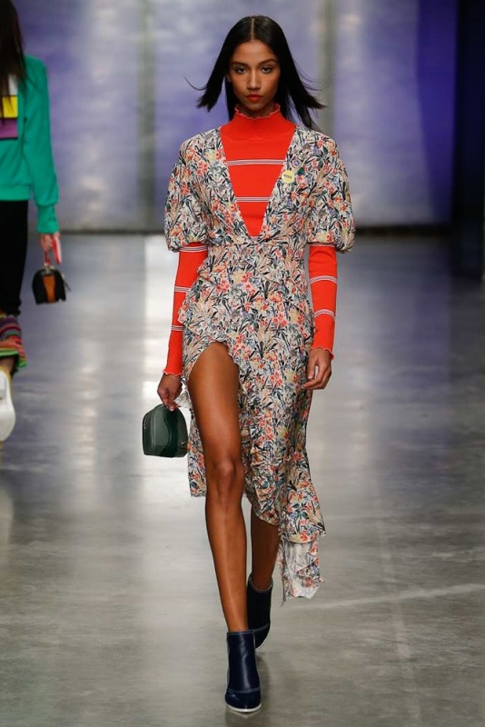 Sans parler de sa coupe qui, entre épaules descendues, décolleté profond mais portable (la version vendue en boutique diffère légèrement du modèle aperçu sur le défilé), manches sobrement bouffantes, fente audacieuse remontant haut sur la cuisse (ce qui permet de "démémériser" en un clin d'oeil le modèle porté par Aiden Curtiss), détails asymétriques et volants placés de manière à diffuser une saveur légèrement conceptuelle, parvient à déjouer la potentielle ringardise du combo imprimé fleuris/volants/longueur midi.