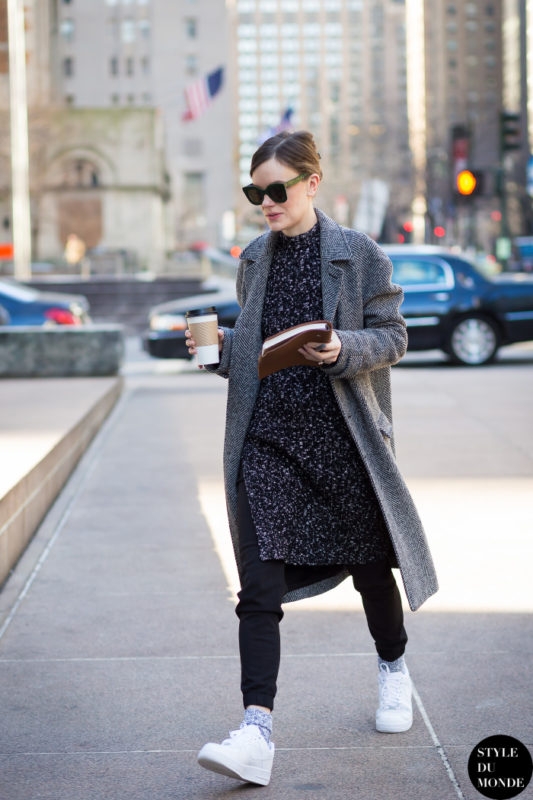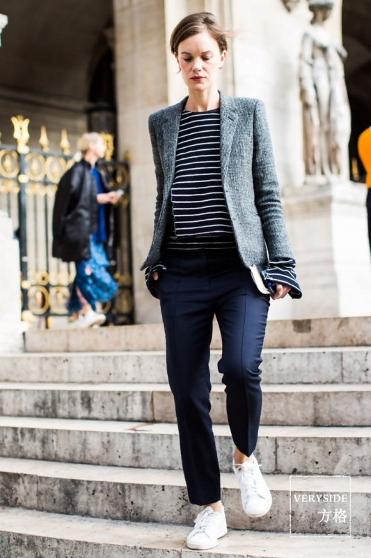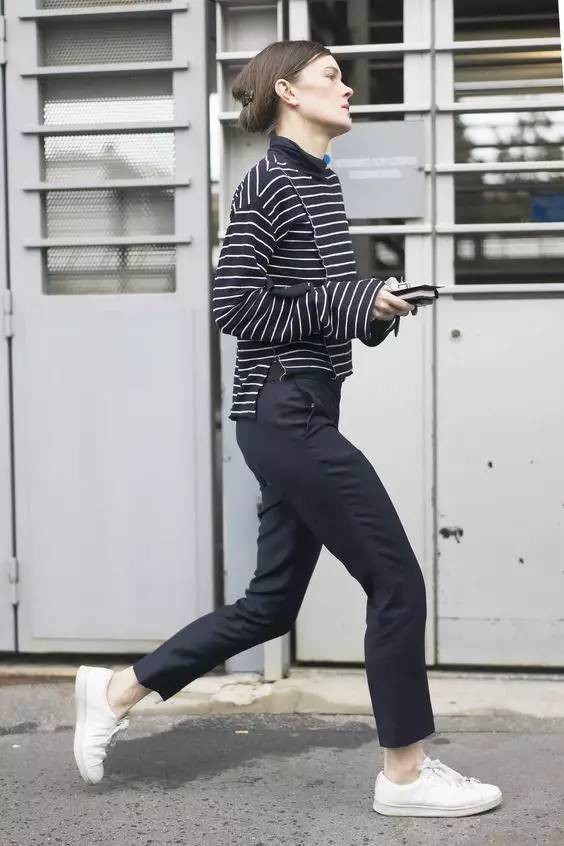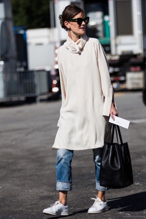 Relever un ensemble sable/camel d'une touche de jaune (voir ici). Twister une tenue classique/casual via une paire de souliers de caractère (voir ici et là). Dénicher le parfait blazer gris, qui lui permettra de porter ses marinières et autres tee-shirts en toutes circonstances (voir ici). Associer dès le printemps pull col roulé et bas plus léger (ici pantacourt et souliers portés pieds nus). Porter ses robes semi-longues avec des bottes hautes (voir ici). Dérider un look unisexe en lui adjoignant une robe droite fendue haut sur la cuisse (voir ici et là). Marier kaki, pointe de jaune et rayures verticales bleues et blanches (voir ici). Choisir ses pièces conceptuelles dans des teintes classiques, afin de pouvoir les porter facilement (voir ici et là). Porter ses pantacourts avec des bottes remontant haut sur le mollet (voir ici). Twister une robe pull ⅞ en la portant avec des sandales types Birkenstock (voir ici).