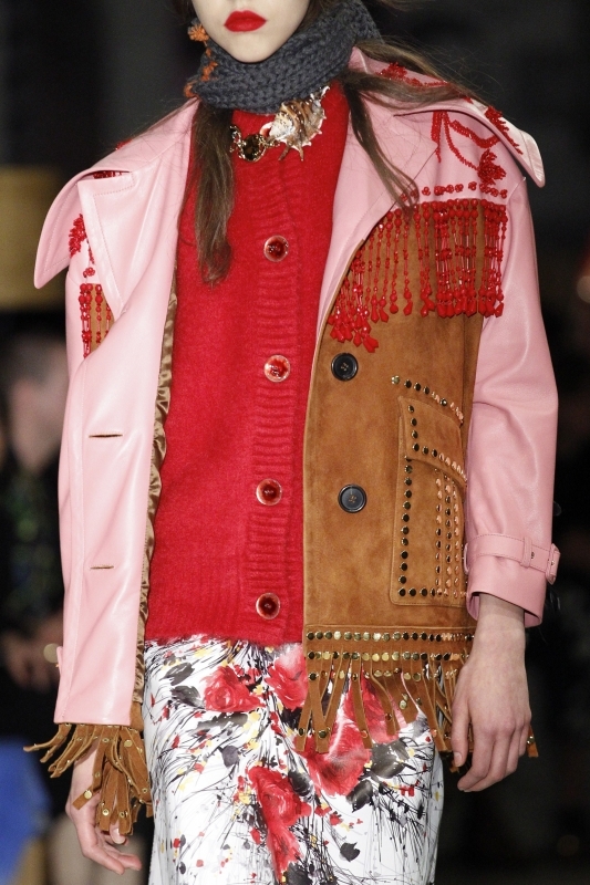 Noir, vert, rouge et marron ne sont a priori pas des teintes que l'on marierait spontanément ensemble... Pourtant, en choissant celles-ci dans des textures fortes (velours côtelé, lainage en grosse maille, tissu à légers reflets ou encore poils hirsutes), Miuccia Prada nous fait entrevoir le potentiel cérébral/fantaisie/élégant de cette association. Dans la pratique, on pensera à marier jupe trapèze en vinyle noir, épais gilet vert forêt, sous-pull fauve, bottes en cuir marron et sac à main rouge.