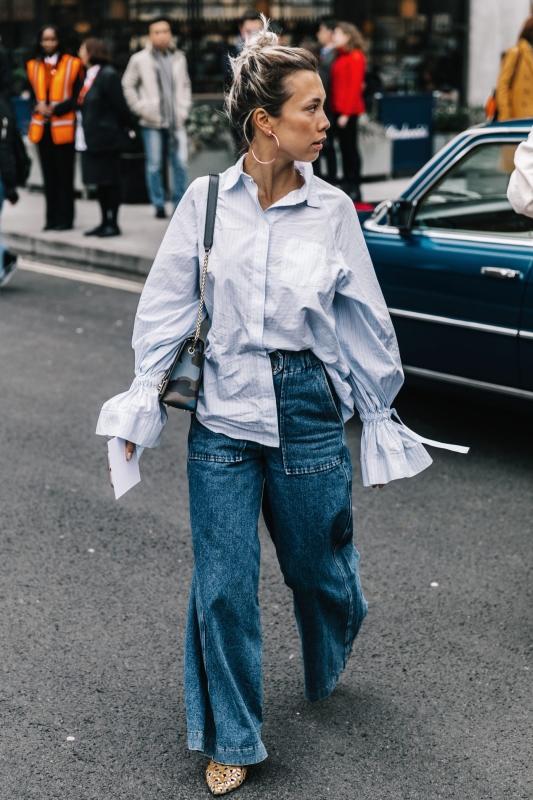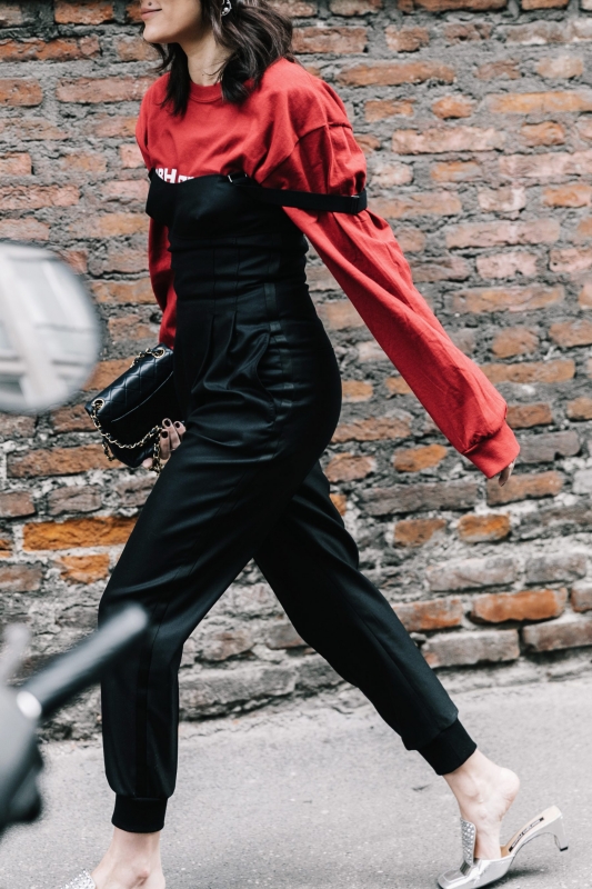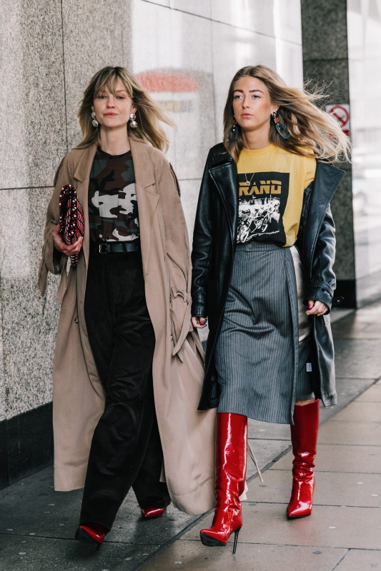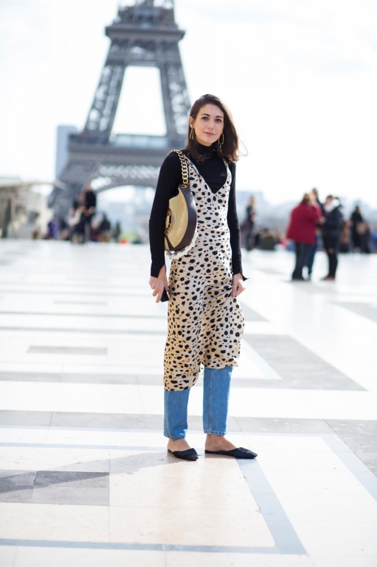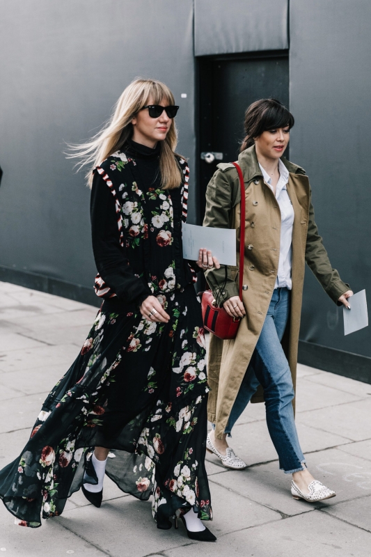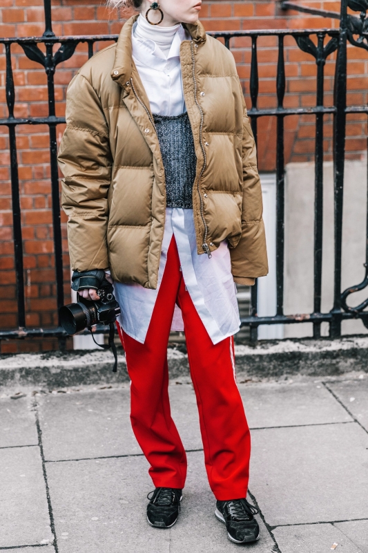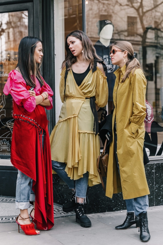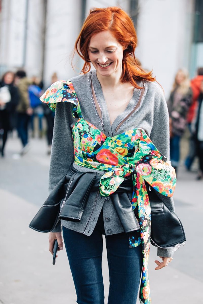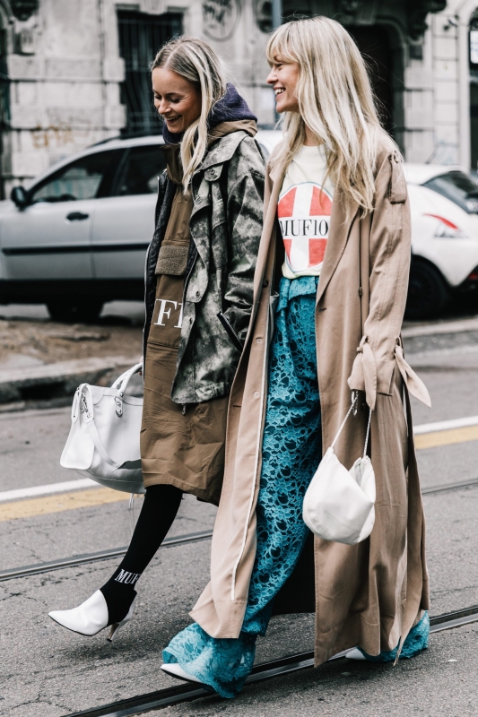 Un vent de liberté souffle sur le dressing des street-styleuses, qui n'hésitent plus à tester associations incongrues, coupes peu communes et superpositions fantasques (voir ici, ici, ici, ici et là). Si le mix trench/hoodie reste une valeur sûre, on préfère lorsque ce dernier s'associe à des manteaux plus audacieux. Déclinée en mode monochrome, la superposition doudoune/perfecto ne manque pas de fashion appeal (voir ici). Les longues robes fleuries tentent de déjouer leur côté fleur bleue à coups de sous-pull, tee-shirt à messages, perfecto, boots massives et autres artifices roots, le tout pour un résultat assez aléatoire… Ne sachant plus à quelle tendance se vouer, le jean expérimente à tout va (voir ici, ici, ici et là). Moins clivant que l'orange, le rose risque fort de gagner le duel pour le titre de "couleur du printemps" qui l'oppose à la teinte halloweenesque (voir ici, ici, ici et là). Les chemises dépassent plus ou moins subtilement de petits pulls courts (voir ici et là). En matière de denim, le maxi ourlet fait de la concurrence aux bords asymétriques (voir ici et là). Les mini bustiers misent sur la néo-pudeur en ne se portant plus à même la peau (voir ici et là).