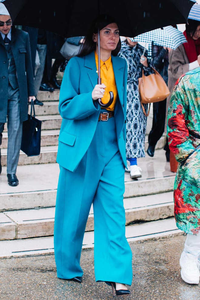 Je ne retiens de vraiment à copier que le manteau Prince de Galles qui change en effet du manteau camel... Et je suis dubitative devant le grand sac bleu fluo effet tergal dans lequel nage littéralement Giovanna Battaglia :-)