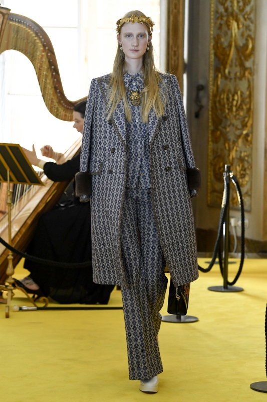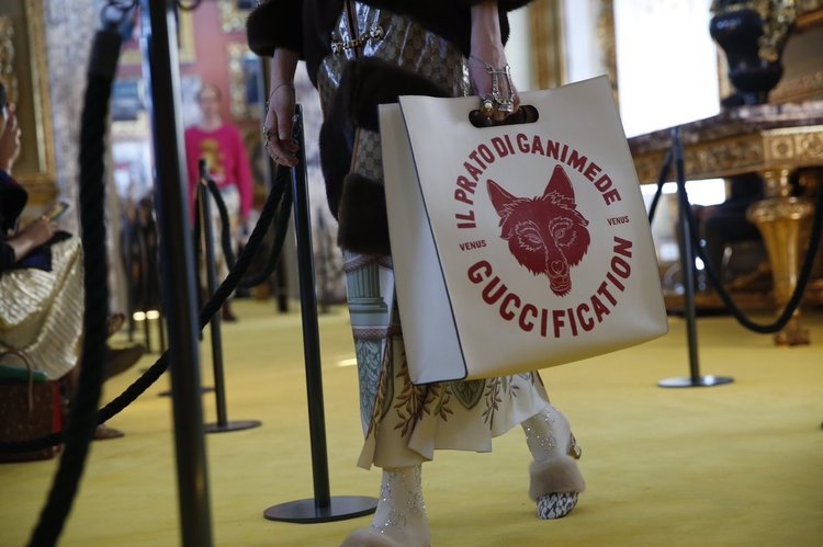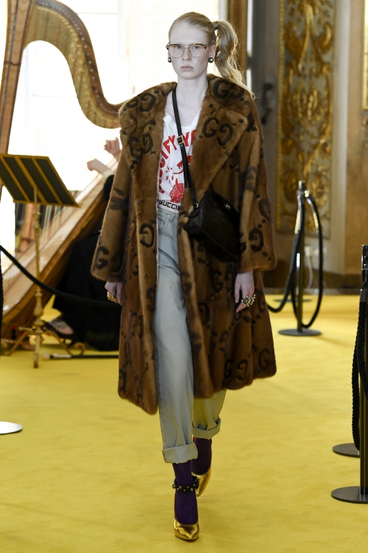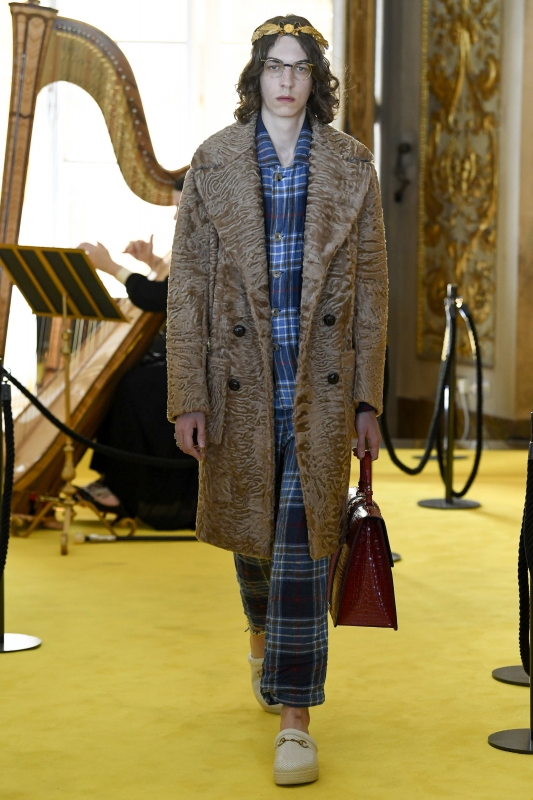 Semblant sortir tout droit d'un sac de fripes non trié, la tenue de ce jeune homme interpelle par son absence totale d'intérêt. Faisant clairement référence au Christ mais ne réussissant pas à transcender la citation, le passage de ce hipster dépressif manque de panache. Si les graphismes et autres motifs imaginés par le DA de la griffe flirtent régulièrement avec le sans faute, ce n'est malheureusement pas le cas de ce tigre au visage de gargouille… A la vue de certaines silhouettes du défilé, on se demande si pour trouver l'inspiration, Alessandro Michele ne se contente pas de piocher un livre au hasard dans sa bibliothèque (Harry Potter ?).