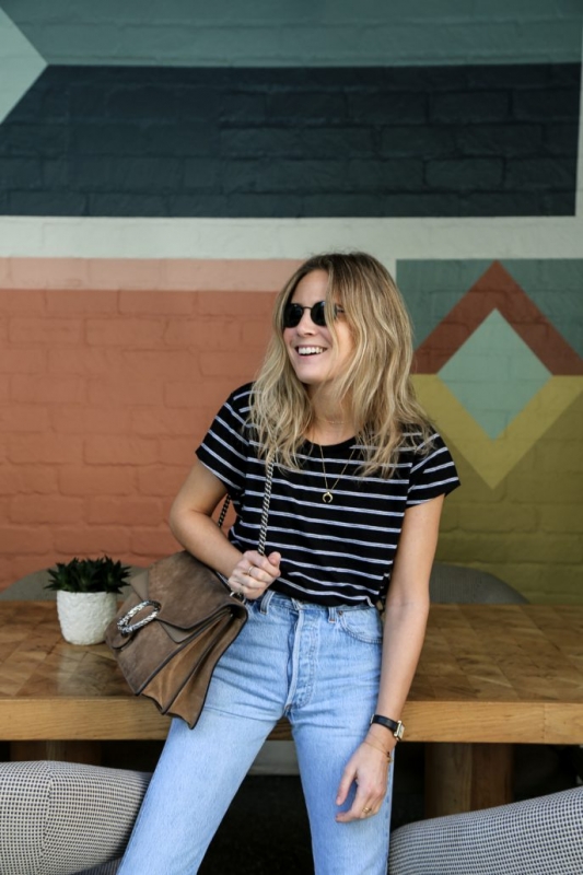 Un jean taille haute coupé court. Un perfecto. Un . Une . Des tee-shirts esprit vintage (voir ici et là). Une mini jupe en jean. Une chemise rayée. Des fines chaînettes dorées agrémentées de pendentifs divers.