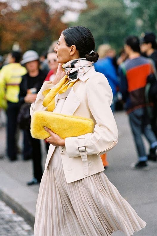 Investir dans une robe pointue et intemporelle mettant sublimement en valeur sa silhouette (voir ici). Ceinturer taille haute sa doudoune (voir ici). Réveiller une robe monochrome via un maxi foulard coloré noué autour du cou (voir ici). Sortir de l'anonymat ses pantalons cigarettes taille haute en leur adjoignant une large ceinture (voir ici). Associer vieux rose luisant, blanc cassé et jean indigo (voir ici). Marier la cosyness d'un pull-over oversize (au col roulé porté déroulé) à la sophistication de lunettes de soleil "cat eye" (voir ici). S'autoriser les mix volumes/imprimés les plus audacieux en les travaillant sur le rectangle supérieur de la silhouette (voir ici et là).
