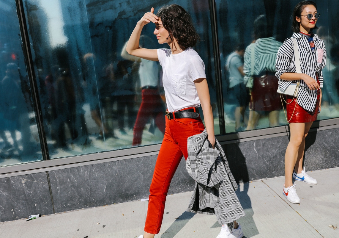 Les looks les plus simples peuvent parfois avoir un impact visuel assez fort. Il suffit ainsi que la combinaison de couleur soit réussie, que les basiques soient bien choisis, que les détails se révèlent dans l'air du temps et que le tout soit rehaussé d'une pièce en vogue conférant suffisamment de modernité au look pour que le duo jean/tee-shirt sorte de l'anonymat. Pour ma part, j'emprunterais à McKenna Hellam sa palette rouge/blanc/gris et son idée de ceinturer un jean 7/8 via une large ceinture à logo.