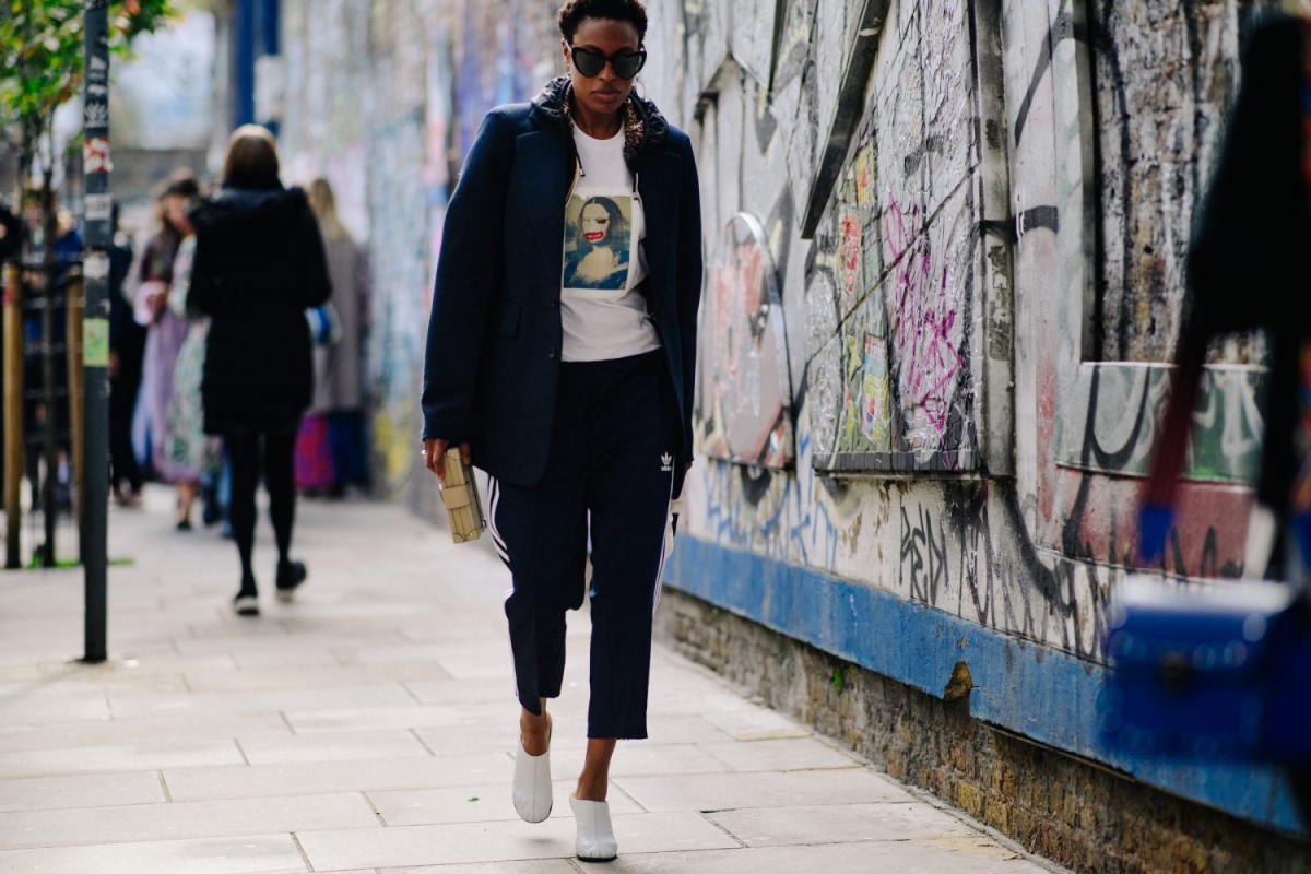 Régulièrement remis au goût du jour au sein des collections, le bas de jogging fait partie de ces pièces que la sagesse nous intime de bannir de toute équation fashion. Pour autant, ce look aperçu lors de la semaine de la mode londonienne pourrait bien nous faire revoir notre position. Porté avec des mules à talons (contournant ainsi le lieu commun du duo "jogging/escarpins") et réchauffé par un habile trio tee-shirt arty blanc/K-way noir doublé de léopard/blazer bleu marine, le jogging Adidas court sur la cheville choisi par Donna Wallace dans un classique bleu marine parvient en effet à éviter tous les clichés et à s'inventer une nature citadine/preppy/sportswear particulièrement intéressante.