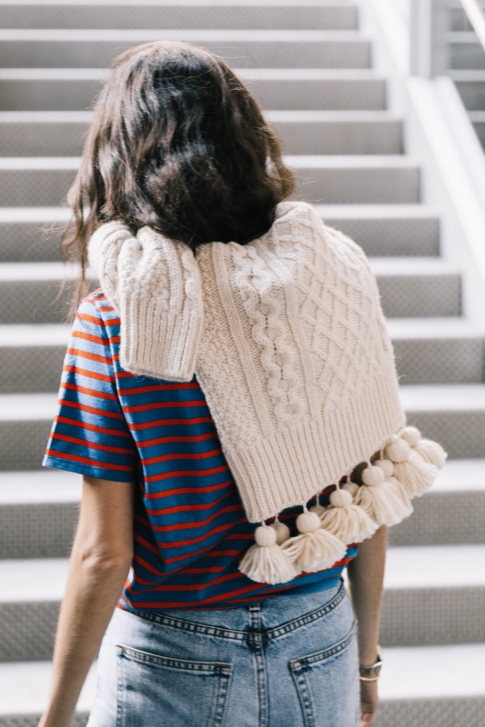 Alors qu'ici à Toronto l'été ne semble pas vouloir tirer sa révérence (ce week-end le thermomètre frôlera les 30 degrés Celsius), les mix and match entre pièces estivales et hivernales m'interpellent tout particulièrement. J'ai en effet hâte de voir les températures descendre et stagner autour des 15-20 degrés afin de pouvoir pendant quelques semaines expérimenter ces télescopages "contre-nature" qui, à l'instar de cette rencontre organisée par Leandra Medine entre un pull-over irlandais et un tee-shirt rayé au coloris seventies, me plaisent plus que de raison.