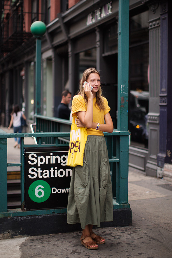 Il arrive parfois que les vêtements composant un look soient totalement sans intérêt sur le plan de la coupe et des matières, mais que leurs teintes, une fois conjuguées, propulsent ledit look dans la catégorie "délicieuse évidence chromatique". C'est à n'en pas douter le cas de la tenue de cette jeune fille qui, en mariant jaune moutarde, kaki et marron, a attiré l'oeil aiguisé de Scott Schuman. Dans la pratique, j'opterais pour des pièces moins insipides, mais conserverais cet alliage de teintes organiques.