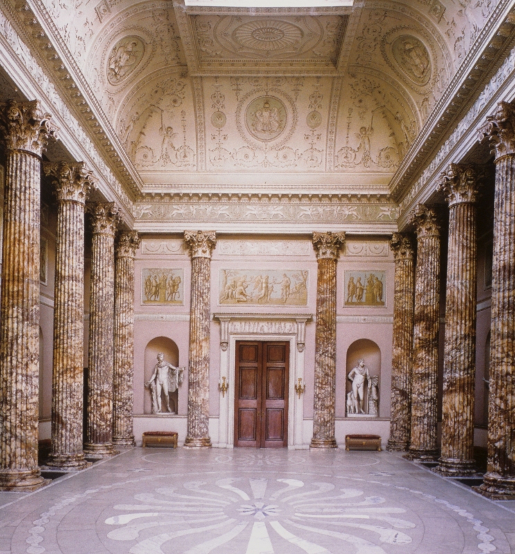 En partie inspirée des pièces à colonnades de marbre de Kedleston Hall (voir ici et là), la palette de coloris fanés contourne les risques d'ennui visuel en se piquant régulièrement des oeillets métallisés (voir ici, ici et là). Le résultat s'avère aussi précis que sensuel, tout en restant à distance de toute déclinaison sirupeuse.