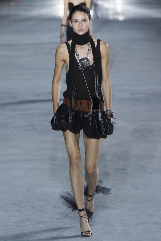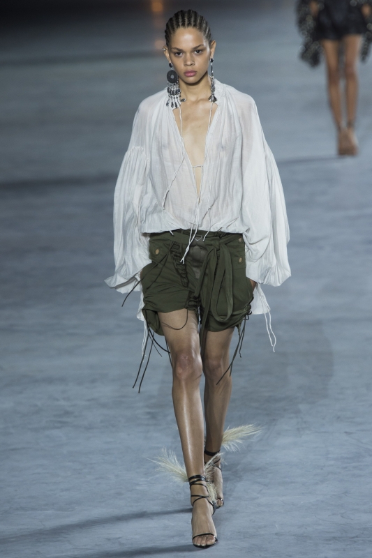 Pour son défilé printemps/été 2018, Isabel Marant développe avec un génie suave l'ADN de sa griffe. Face à ses superpositions d'étoffes piquées de fils de lurex, ses shorts en cuir taille haute haute bien taillés, ses bottes à la parure froufroutante et ses sensuelles blouses de mousquetaire, on se dit ainsi que la créatrice parisienne est en grande forme. Seule ombre au tableau : contrairement aux apparences, nous ne sommes pas ici chez Isabel Marant, mais bel et bien chez Saint Laurent...