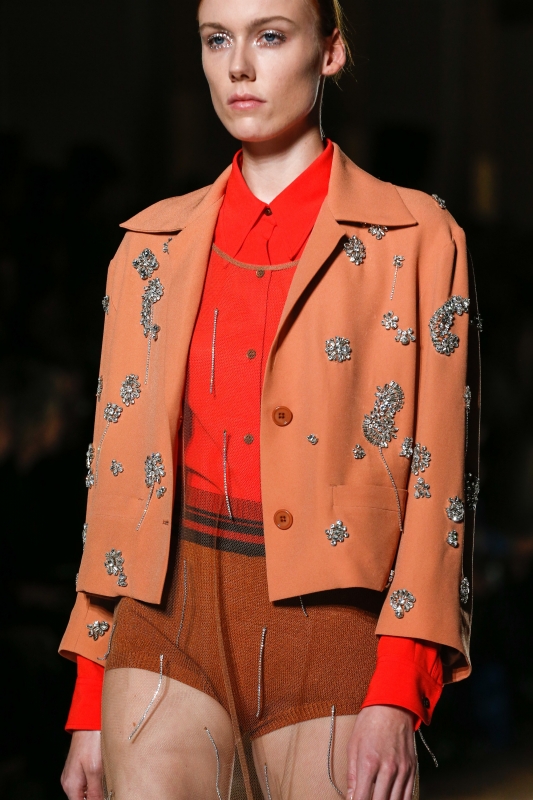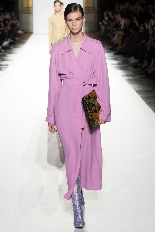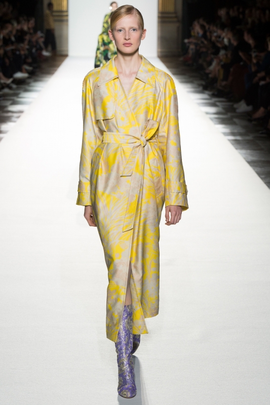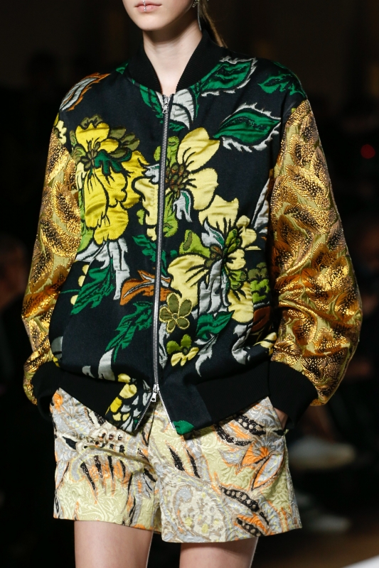 C'est ainsi qu'aujourd'hui, les désormais traditionnels pardessus se piquent de broches strassées et que les blazers à la carrure "powerful" se parent de fines fougères jaunes sur fond cacao. De même, les trenchs profitent de leur coupe classique pour se permettre quelques extravagances colorées (voir ici, ici et là), tandis que les blousons de baseball aux riches brocarts semblent avoir été conçus pour être capables réveiller n'importe quelle pièce carbone.