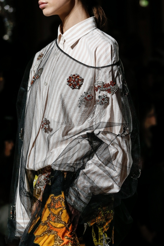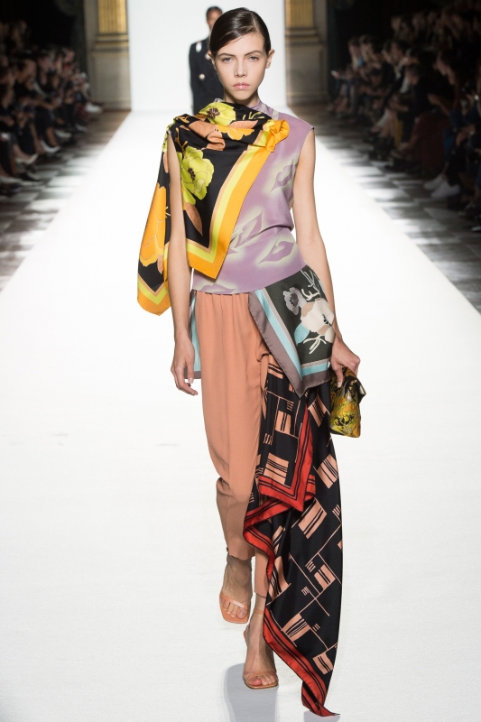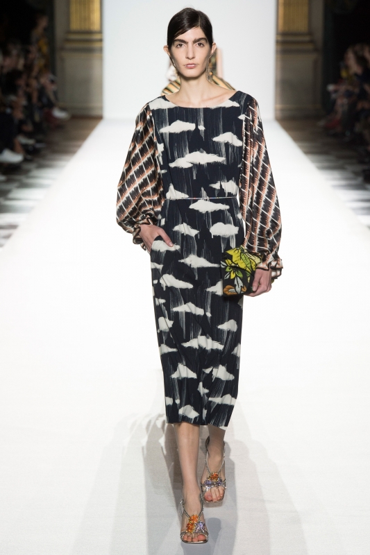 On note par ailleurs que parmi les nombreuses propositions de ce coloriste de talent, l'imprimé nuage et le trio coquelicot/mandarine/tabac sont celles qui retiennent le plus l'attention. De leur côté, le gimmick du voile de tulle (voir ici et là) et les foulards croyant se suffire à eux-mêmes se révèlent aussi faciles que décevants.