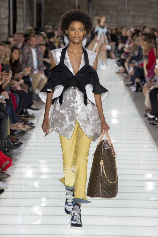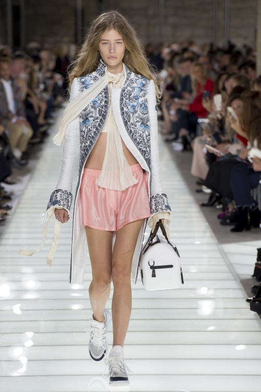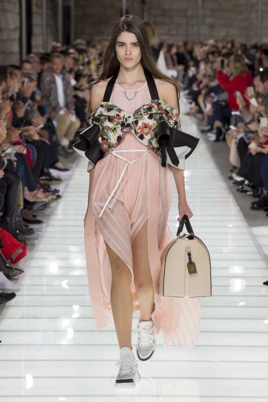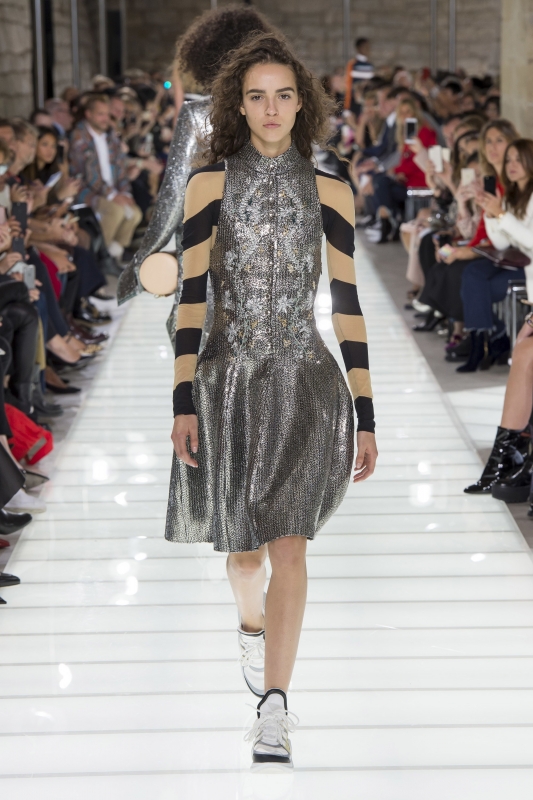 D'ordinaire obstinément tourné vers le futur, Nicolas Ghesquière tente cette saison une nouvelle expérience en délaissant les références SF au profit d'une plongée au sein du 18e siècle. Inspiré par les costumes d'époque vus au MET, le DA de Louis Vuitton s'est en effet piqué de transposer ceux-ci au sein d'une garde-robe contemporaine. Pour ce faire, il impose aux redingotes chères à la cour de Louis XVI un dress code sportswear où short et baskets ont la part belle. Le résultat se révèle le plus souvent enthousiasmant. Il est vrai que si certaines redingotes flirtent avec le costume de théâtre, la plupart d'entre elles s'apparentent plus à une réinterprétation inspirée (ici et là). Et si le gimmick du corsage oversize ne convainc pas (voir ici et là), les petites robes aux volumes "mini crinoline" brillent quant à elles par leur juste mesure. On retiendra par ailleurs l'association blouse romantique/tee-shirt geek qui, en confrontant volume vaporeux et coton épais, compose un duo intéressant. Sans parler de la partie "soir", aussi gracieuse que moderne. En résumé, Nicolas Ghesquière se fait à la fois plus doux et moins froid, offre ainsi à l'univers Louis Vuitton un indéniable vent de fraîcheur.