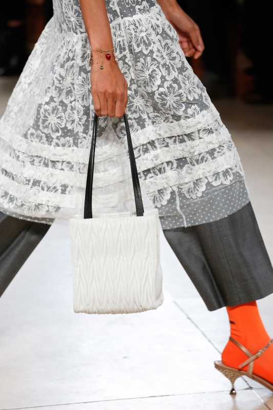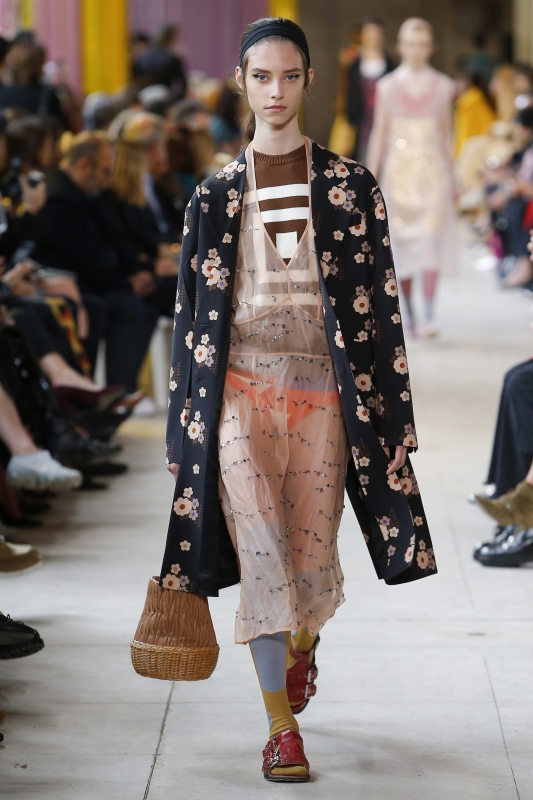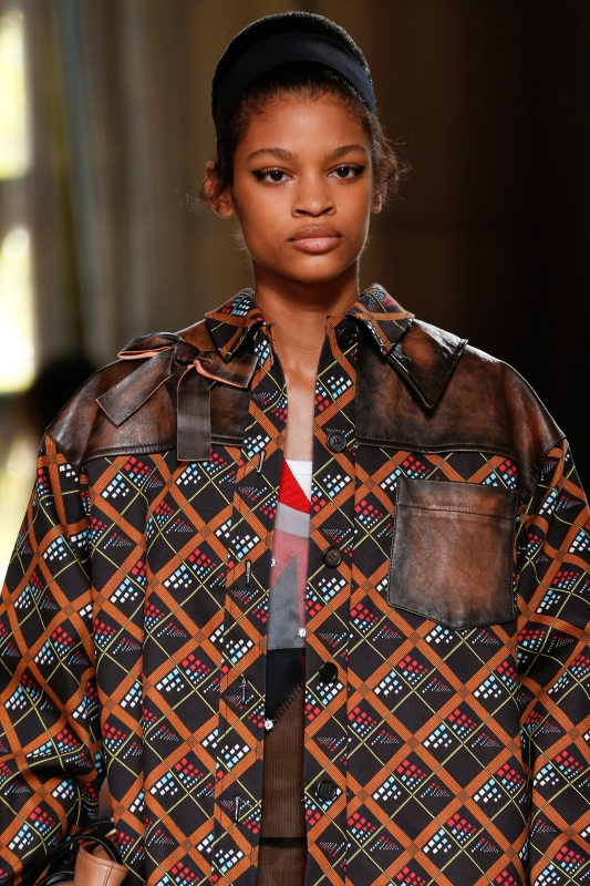 Plus brouillon que d'ordinaire, le défilé Miu Miu manque de raffinement et de colonne vertébrale stylistique. Pour autant, les blousons bi-matières cuir/coton imprimé papier peint, le gimmick robe en dentelle midi sur pantalon de ville 7/8 et le combo bleu marine/chair/marron/touche d'orange ne devraient pas laisser indifférentes les inconditionnelles de la ligne bis de Miuccia Prada.