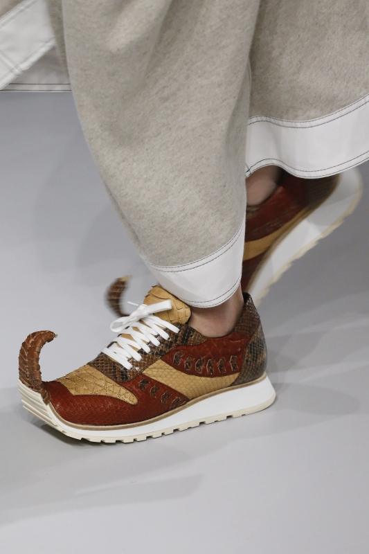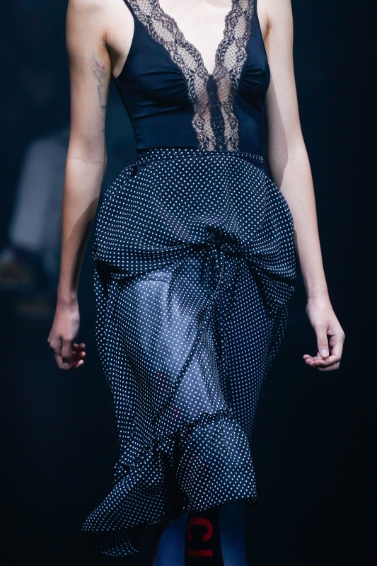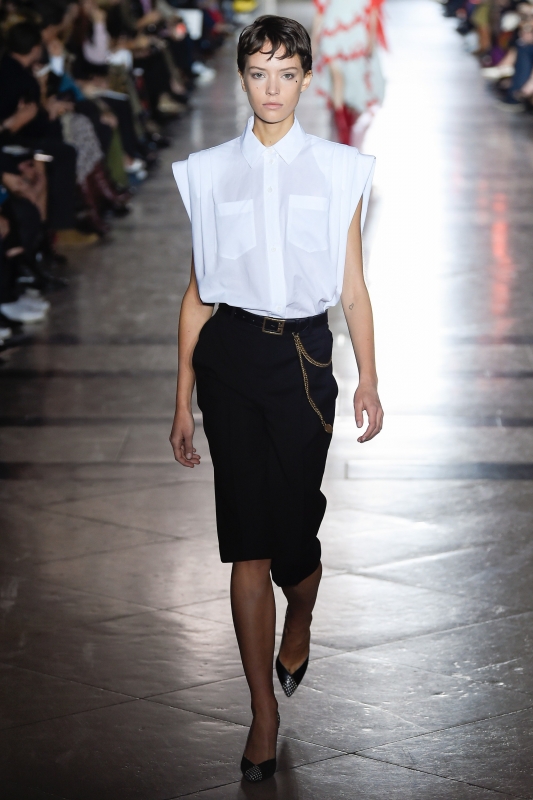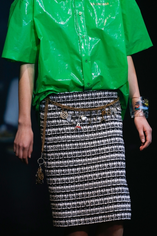 Demna Gvasalia est incontestablement un homme de son temps : il assimile le travail de ses prédécesseurs comme on "pin" des images sur son tableau Pinterest, s'imprègne des ondes chaotiques diffusées par les chaînes d'info en continu et s'interroge sur les stéréotypes de notre société. Et si cela donne naissance cette saison à une collection Balenciaga faisant un peu trop référence aux grammaires de Rei Kawakubo et de Martin Margiela, le créateur n'en livre pas moins des silhouettes inspirantes ainsi que quelques très belles pièces. En s'emparant des codes bourgeois et en les conjuguant de manière ironique, Demna Gvasalia offre en effet une vision alternative de la jupe crayon tweed, du gimmick consistant à nouer son pull sur les épaules et de la veste d'extérieur col Claudine. De leur côté, les amples manteaux évoquant le travail de Cristobal Balenciaga font figure de petit joyau prêt-à-porter, tandis que les jupes de saison façon pencil/parachute et les robes aux fronces astucieusement placées s'inscrivent sensuellement dans la catégorie "négligés contemporains". Et si le pull oversize bordé de dentelle fait figure de favori parmi les best-sellers en vue, le cas des Crocs compensées reste quant à lui à trancher…