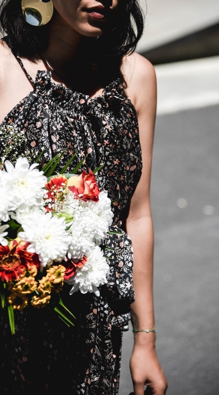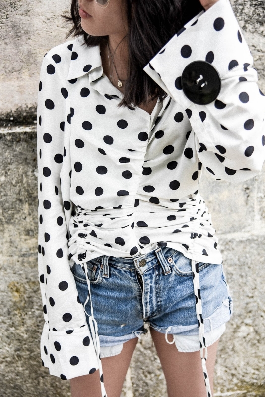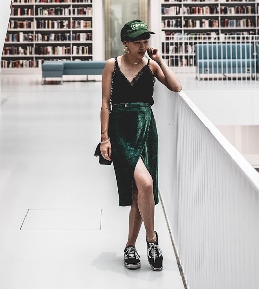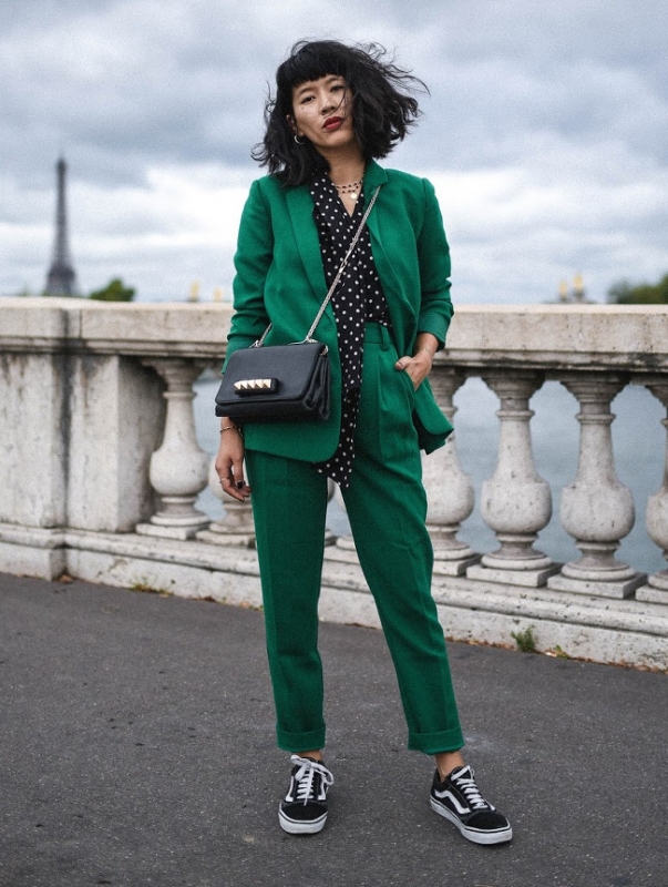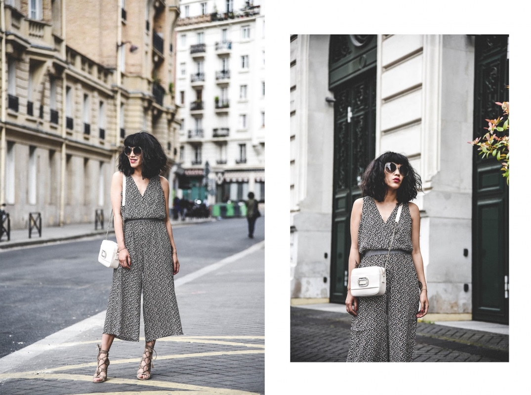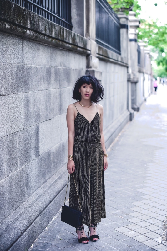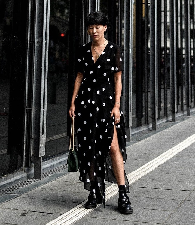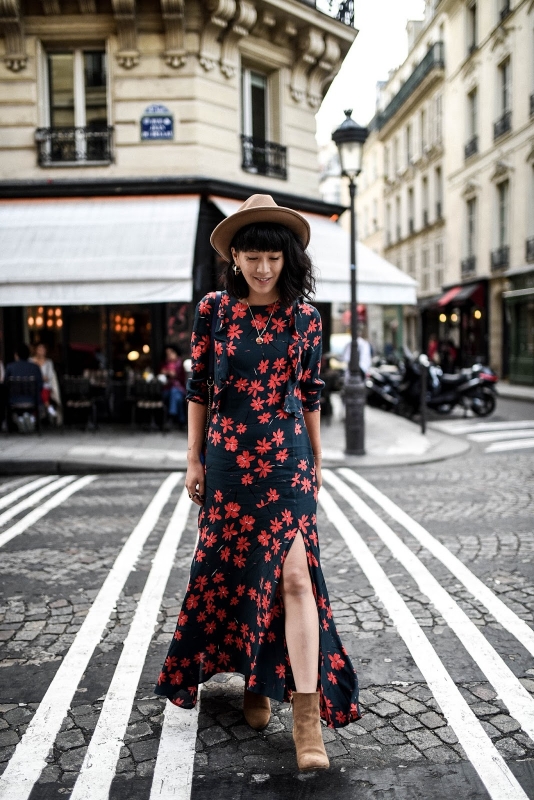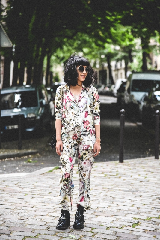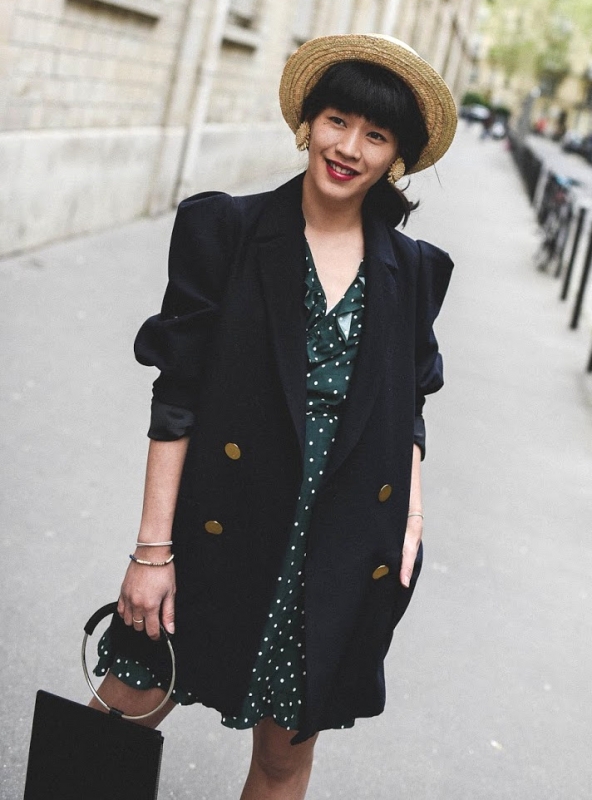 Porter son top kimono croisé et glissé dans un jean taille haute (voir ici). Traiter l'imprimé pois sur une note non conventionnelle (voir ici). En été, troquer de temps à autre sa robe longue contre une combinaison pantalon un brin ample (voir ici, ici, ici et là). Dédramatiser le duo jupe portefeuille en velours ras/caraco en le confrontant au mix casquette/baskets (voir ici). Twister ses longues robes au contact de boots massives ou de bottines (voir ici, ici et là). Économiser quelques centaines d'euros en prenant le temps de dénicher la perle rare au sein de l'offre fast fashion (ici un tailleur pantalon Topshop). Faire la part belle aux imposantes - mais toujours délicates - boucles d'oreilles dorées, dont le chic néo minimaliste se révèle être un excellent exhausteur de look (voir ici et là). Miser sur des imprimés discrets mais sortant de l'ordinaire (voir ici). Associer ses robes les plus girly à une paire de baskets (voir ici).