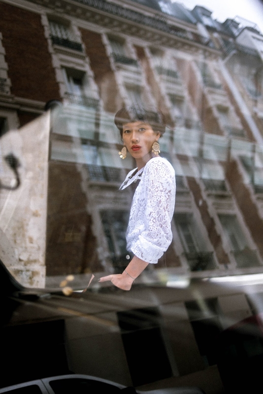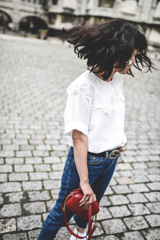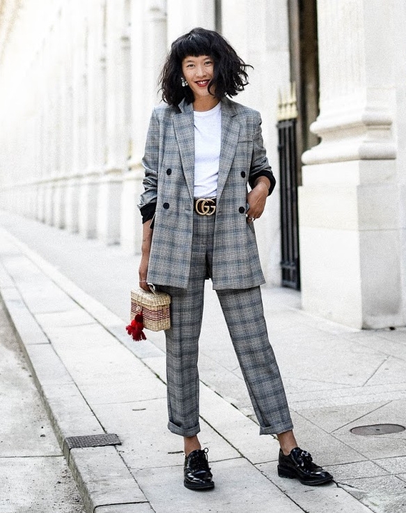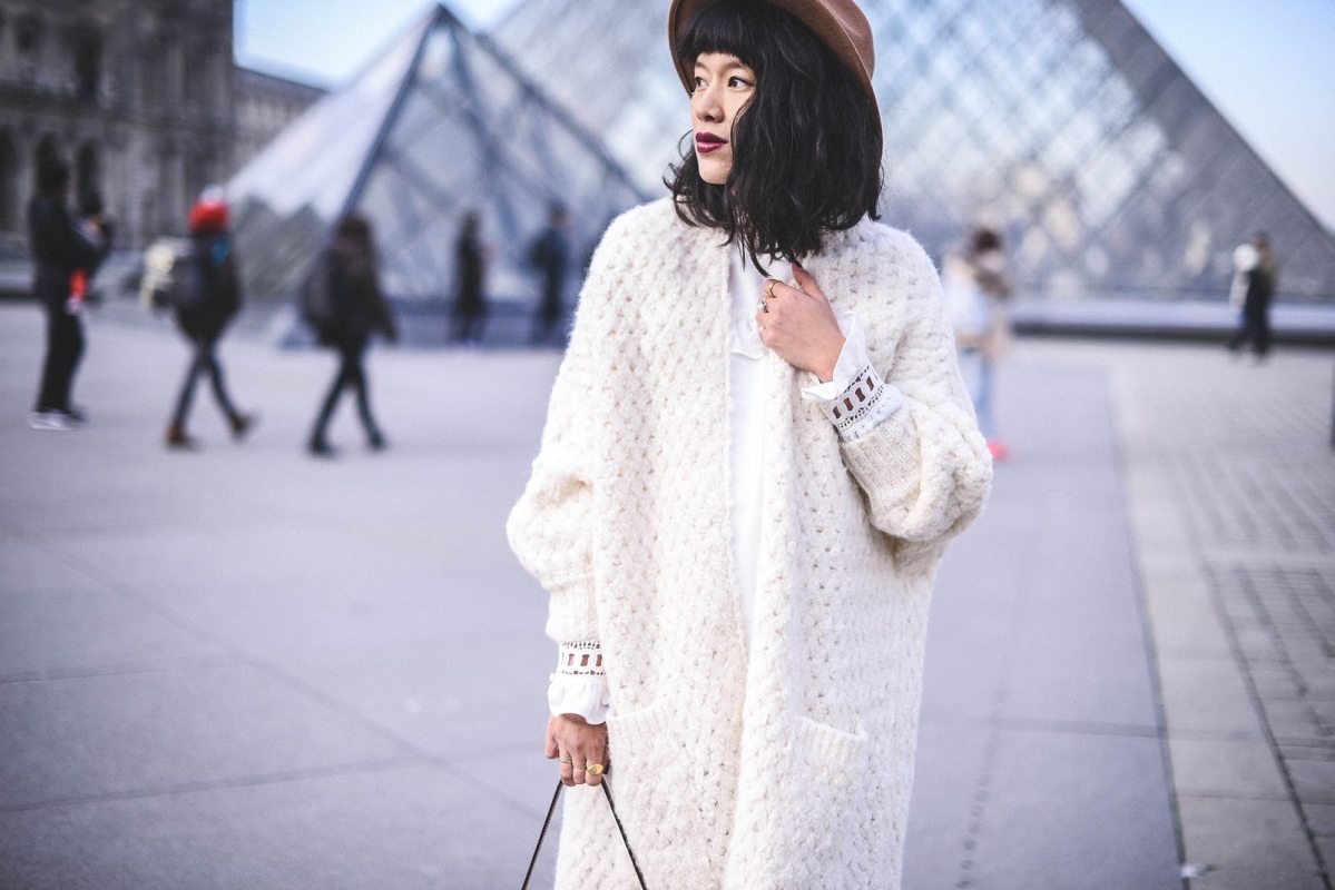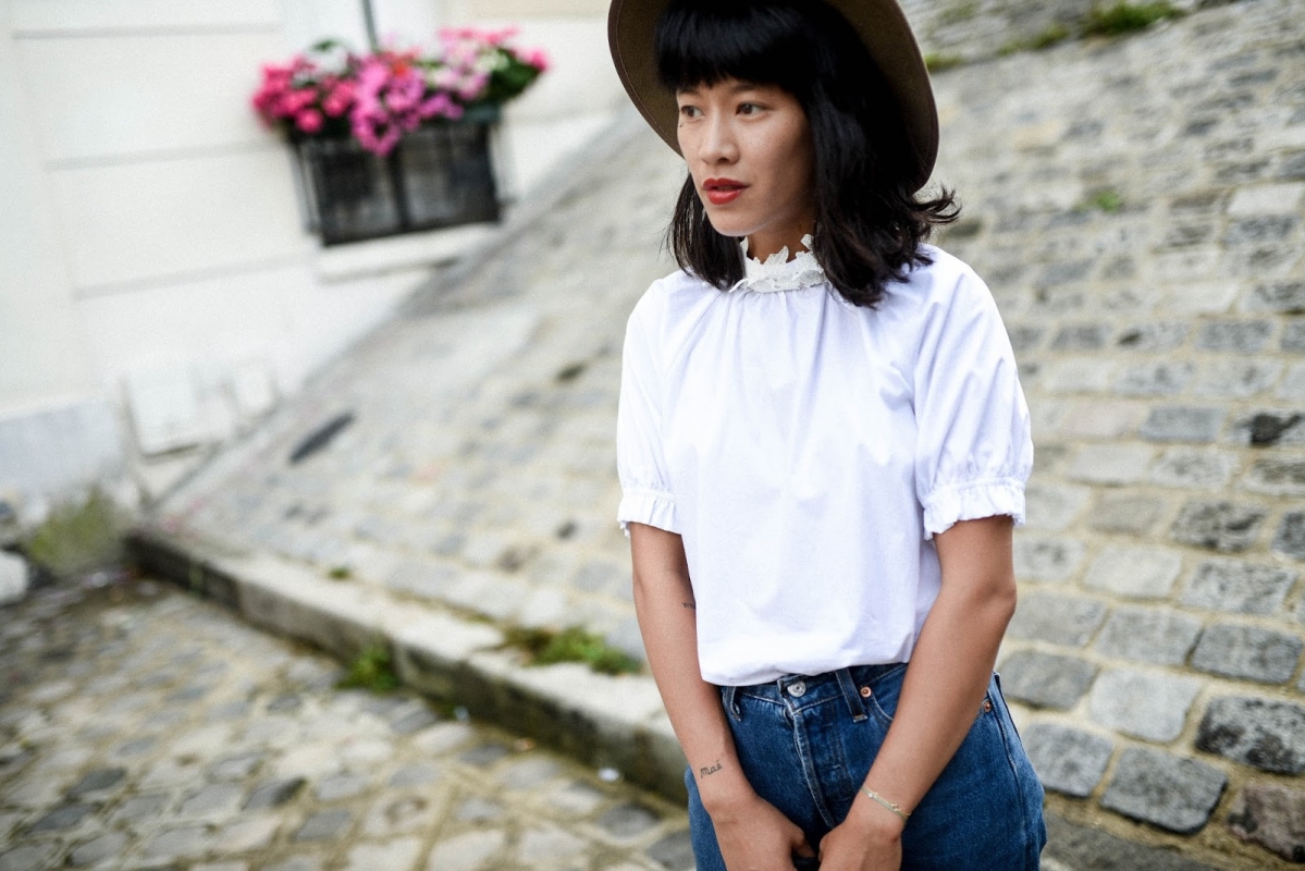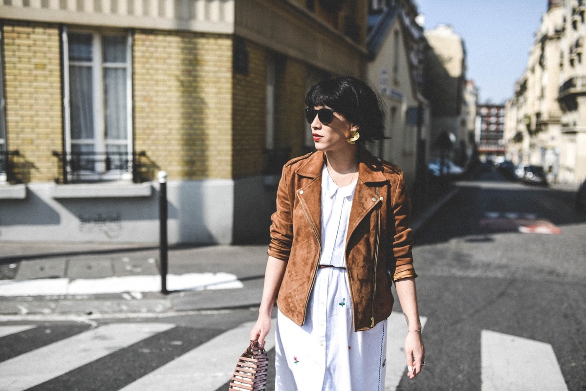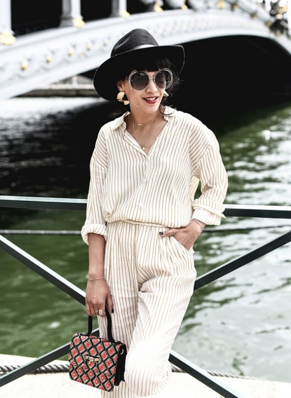 Réchauffer ses robes blanches au contact d'un perfecto fauve (voir ici). Injecter de la nonchalance au tailleur pantalon en le portant avec des baskets, la chemise à moitié glissée dans le pantalon (voir ici). Accompagner ses jeans non pas d'un tee-shirt blanc, mais d'une blouse/chemise immaculée (voir ici et là). Trouver une alternative à la combi pantalon en misant sur l'ensemble pantalon/chemise imprimée (voir ici et là). Roulotter les manches de son trench pour laisser apparaître le début de l'avant bras (voir ici). Porter un long blazer masculin sur une robe ne dépassant que d'un ou deux centimètres de celui-ci (blazer Zara). S'amuser à accentuer la dimension sixties de sa frange via une paire d'immenses lunettes rondes (voir ici). Marier chapeau à larges bords et créoles dorées (voir ici). Contrebalancer l'aspect douillet d'un long et épais gilet par une blouse aux poignets raffinés (voir ici). Faire contraster manteau oversize masculin et souliers féminins (voir ici).