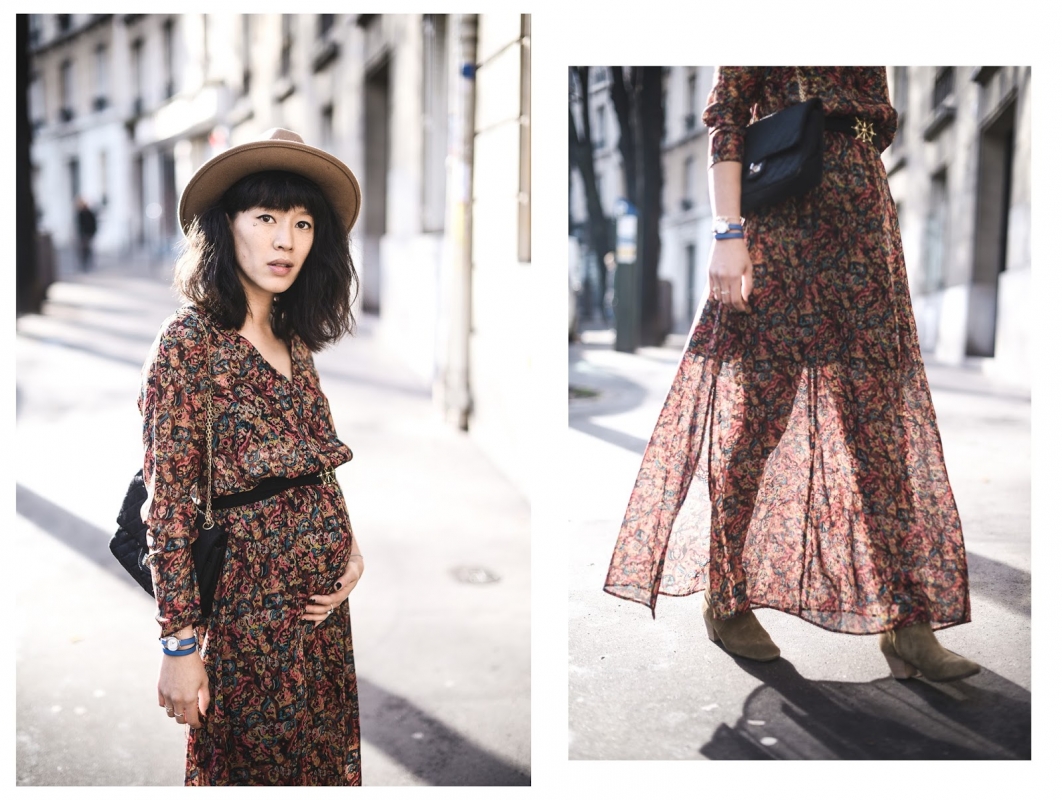 Ceinturer ses amples robe longues (ou courtes) au dessus de son ventre (voir ici, ici et là). Mettre son ventre en valeur dans un pantalon large taille haute (voir ici). Sophistiquer la sempiternelle salopette en y glissant une blouse en dentelle (voir ici).