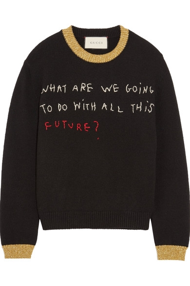 Copiant ostensiblement son cousin germain qu'est le sweat, le pull-over offre cette saison sa maille aux slogans les plus divers. Sur son cachemire se brodent ainsi à la main - les broderies réalisées à la machine manquant trop de personnalité et d'aspérités pour retenir l'attention - des messages plus ou moins subversifs permettant aux fashionistas d'afficher ostensiblement leur conviction du jour (Lingua Franca) ou leur interrogation du moment (Gucci). Le point positif de cette tendance : avoir la possibilité de transformer - avec un peu de patience - son cachemire Uniqlo en pièce créateur...