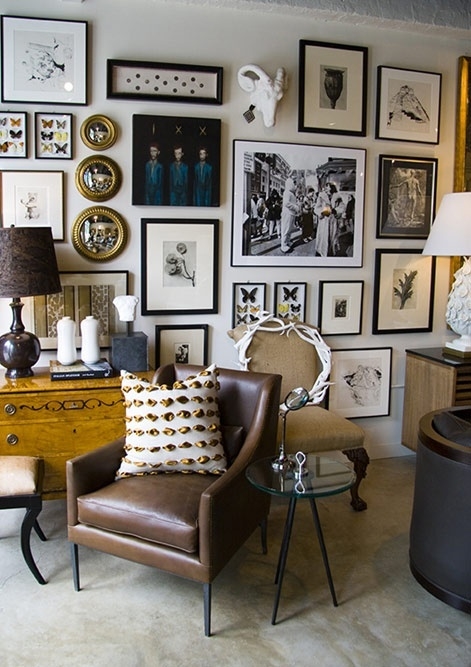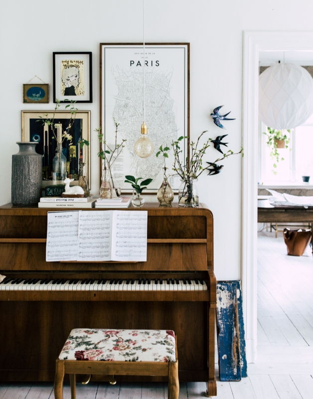 Transformer un mur en cabinet de curiosité (voir ici). Collectionner les plaids en tous genres afin d'être toujours bien au chaud, que ce soit au creux d'un canapé ou assis dans un profond fauteuil (voir ici et là). Se servir des dimensions d'un meuble pour délimiter la zone à décorer au dessus (ici les cadres ne dépassent pas la largeur du piano). Créer des accumulations d'objets personnels (voir ici et là). Récupérer dans nos galeries d'art de prédilection les cartes postales des oeuvres que l'on apprécie le plus et les disposer encadrées au niveau de notre plan de travail. User et abuser des éléments faits main (plaid tricoté, poterie, napperon brodé…) qui permettront de contrebalancer les accents minimalistes de certains éléments (longue table à manger épurée, blanc omniprésent). Changer toutes nos ampoules contre des ampoules à LED jaunes. Mixer meubles massifs et structures délicates.