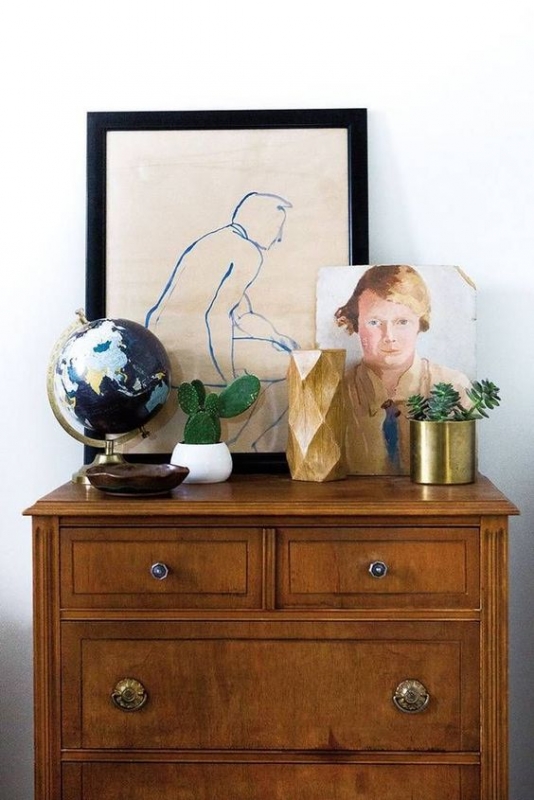 Suspendre un immense tableau dans un endroit inattendu (ici une salle de bain). Confronter matériaux organiques (table en bois brut) et objet rococo (lustre perlé) (voir ici). Oser la couleur là où l'on l'attend le moins (voir ici). Laisser leur chance aux meubles en bois sombre (voir ici). Ne pas hésiter à créer du désordre végétal (voir ici et là). Chiner des meubles et les détourner de leur fonction d'origine (voir ici). Partir en quête d'objets en céramique à l'imperfection apaisante (voir ici, ici, ici et là).