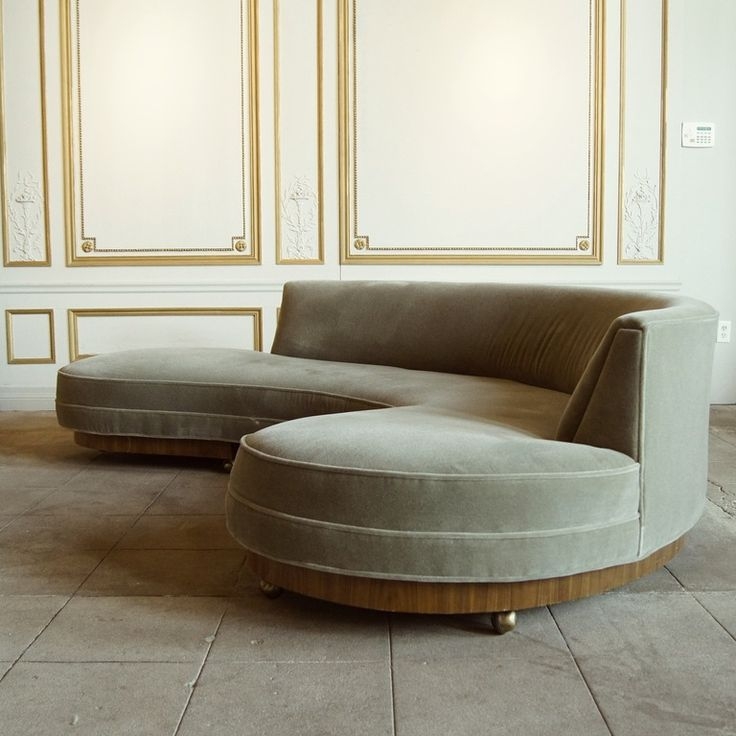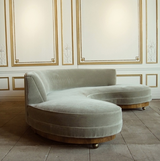 Avec ses courbes au glamour quasi organique, ce canapé de Vladimir Kagan génère une sensation visuelle de confort élégant qui lui confère une aura irrésistible. Conçu vers 1950 par celui qui compta notamment Marilyne Monroe parmi ses clients attitrés, celui-ci a des allures de colline pour salon, de vague d'intérieur, de bulle fonctionnelle, d'excroissance raffinée qui me laisse à penser qu'il pourrait se suffire à lui-même et rendre ainsi incongrue la présence d'autres meubles à ses côtés. Je l'imagine en effet fort bien trônant magistralement en solitaire sur le parquet d'une vieille demeure, la teinte de sa robe évoluant au fil de la journée et ses courbes chics ne demandant qu'à accueillir la langueur de ses propriétaires...