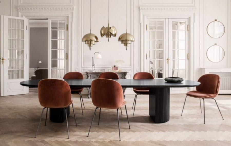 Conçue par le couple de designers Stine Gam et Enrico Fratesi, la chaise Beetle se révèle être un condensé du travail de ce duo danois/italien, entre rigueur des lignes, confort des matières, poésie des télescopages, influences sixties et simplicité des volumes faussement familiers. À mi-chemin entre la chaise de cuisine et l'ébauche de fauteuil, ce photogénique scarabée (la forme de la chaise s'inspire de la forme, de la carapace et de la structure de l'insecte) aurait selon moi toute sa place autour d'une table en béton ou en bois brut. Déclinées en terracotta, ces chaises apporteraient alors ce qu'il faut de chaleur à l'espace, de confort à l'assise et inciteraient à prolonger le dîner jusque tard dans la nuit...