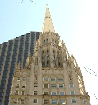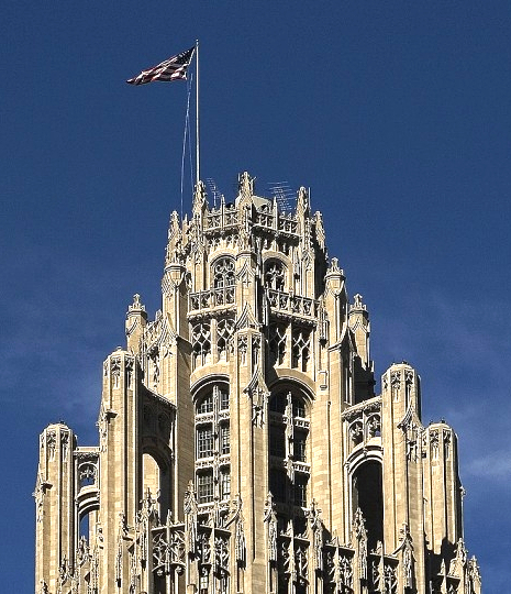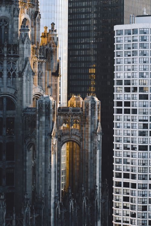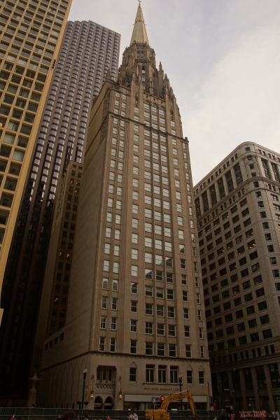 Notre première prise de contact avec le quartier "The Loop" au sein duquel nous avons choisi de résider se fit à la nuit tombée. Dans la pénombre de cette fin de journée hivernale, je fus subjuguée par les sommets illuminés de certains gratte-ciels. Aussi fuselés et délicats que les flèches d'une cathédrale (Tribune Tower, Chicago Temple Building), ces derniers surplombent des édifices plus modernes que gothiques (voir ici et là), créant ainsi une impression confuse, proche de l'émerveillement.