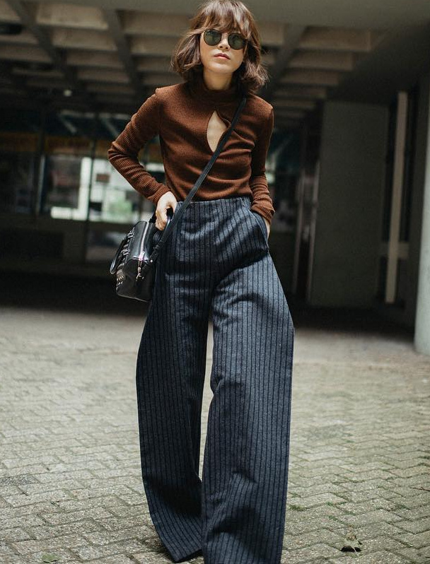 Confronter l'étroitesse d'un top moulant à manches longues à l'ampleur d'un pantalon taille haute ultra large (voir ici).