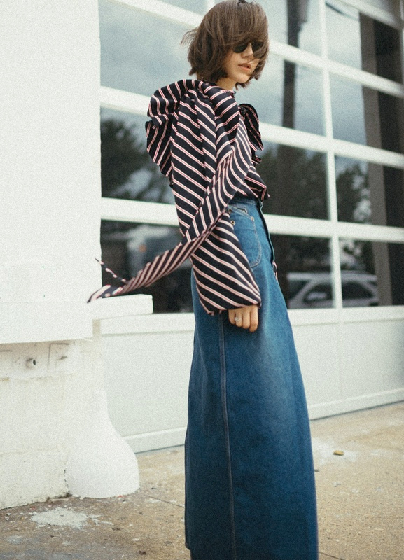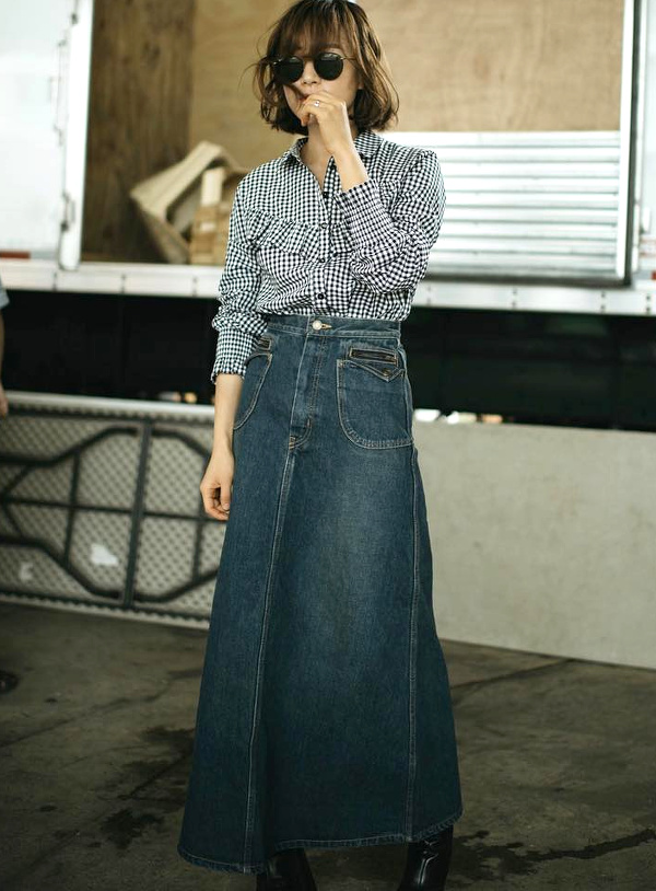 Oser se réapproprier la jupe longue en jean (voir ici et ).