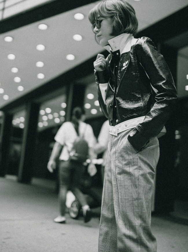 Marier petit blouson en cuir ciré et pantalon large prince de Galles (voir ici).