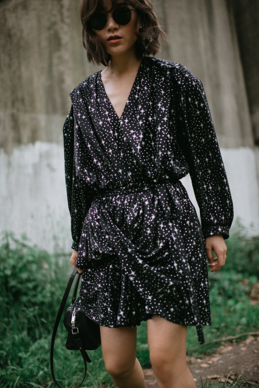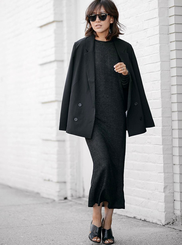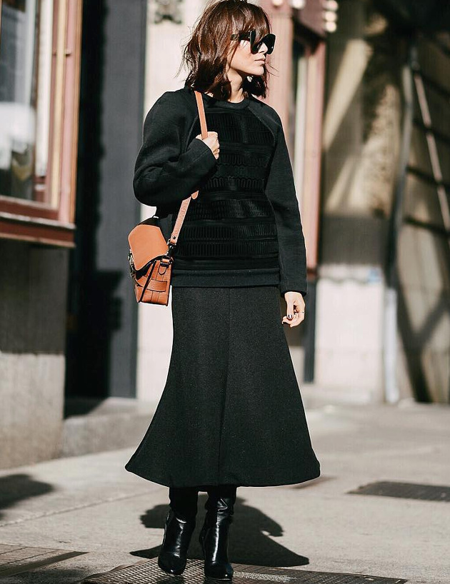 Travailler le total look noir en télescopant les matières et les styles (voir ici et ).