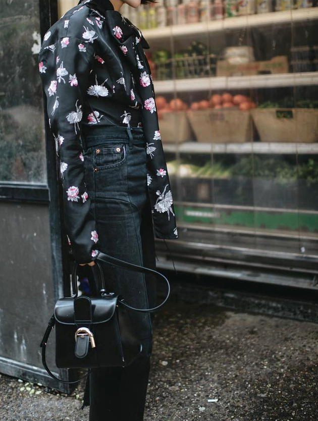 Marier blouse noire fleurie et jean droit taille haute noir légèrement délavé (voir ici).