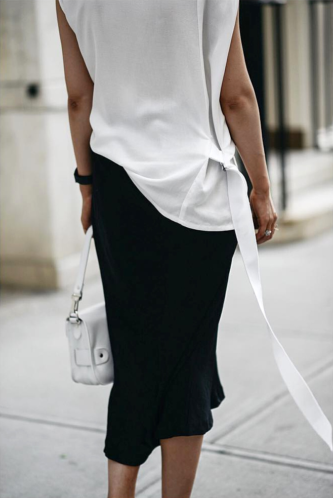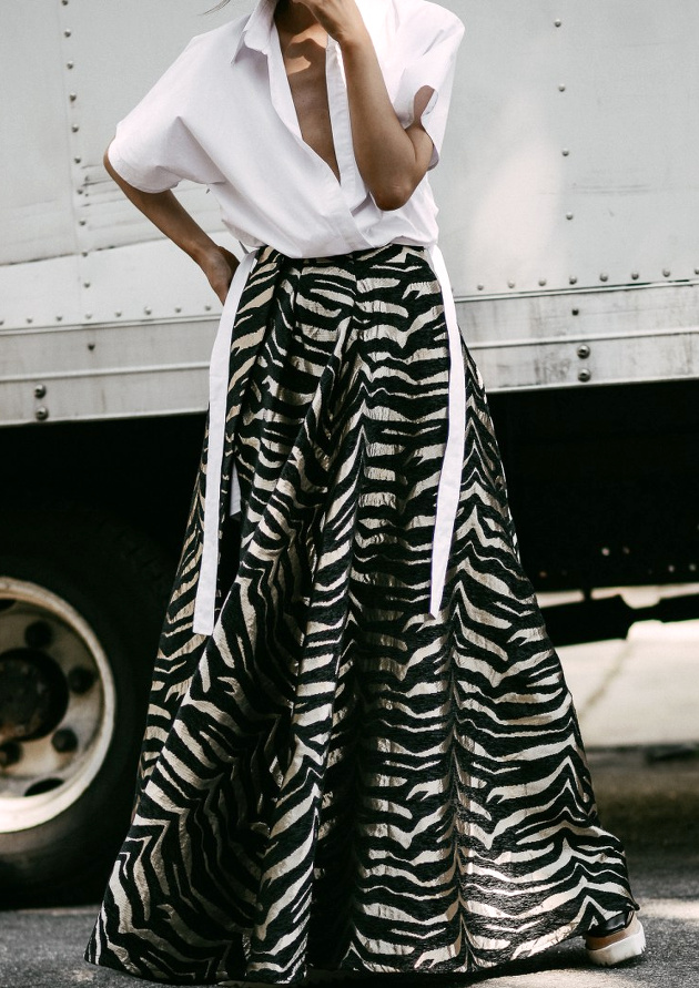 Apaiser une longue jupe de bal en la mariant à une sage chemise blanche (voir ici).