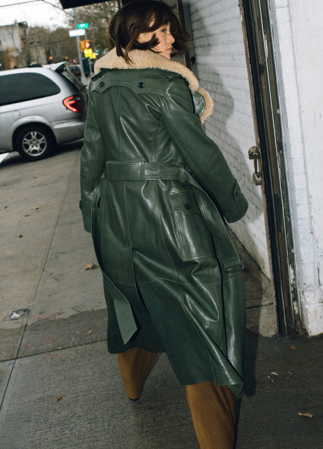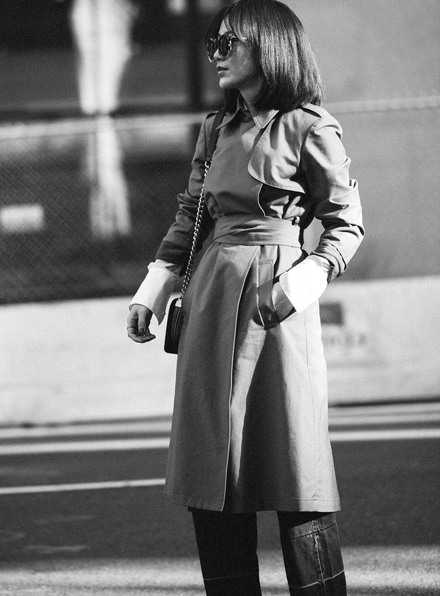 Porter son trench camel fermé et ceinturé taille haute (voir ici).