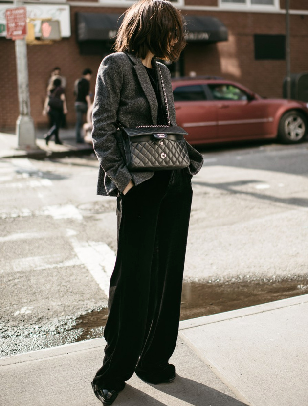 Traiter le velours ras en mode plus casual chic que glamour (voir ici).