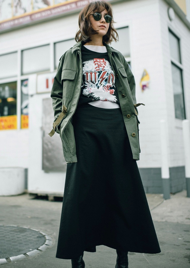 Dérider la jupe longue ligne A en la réchauffant au contact du duo tee-shirt rock/veste militaire kaki (voir ici).