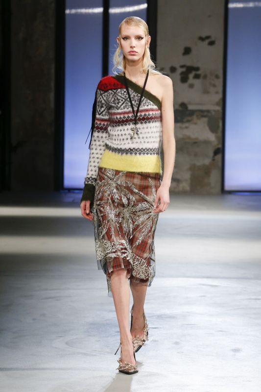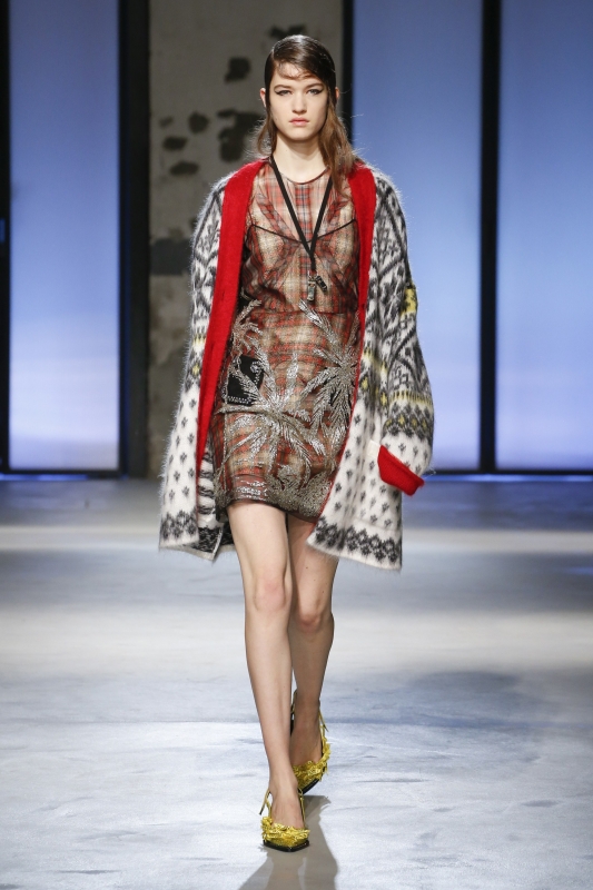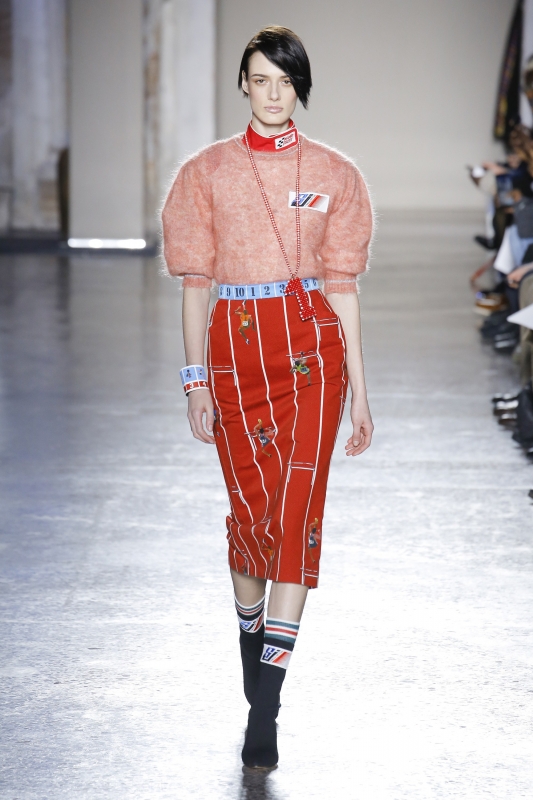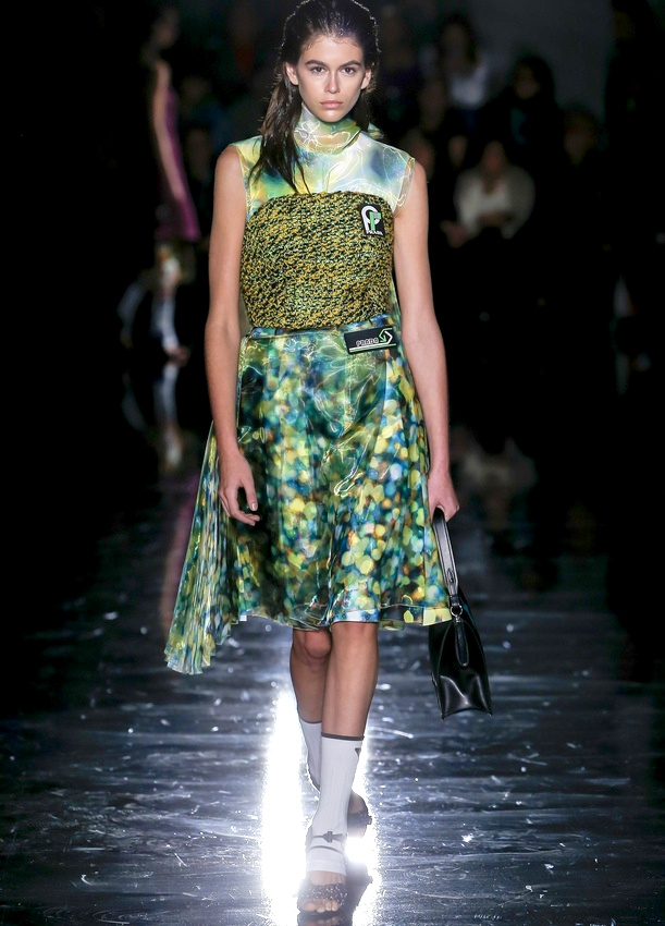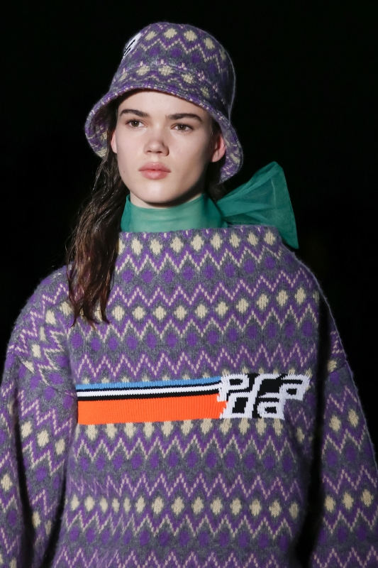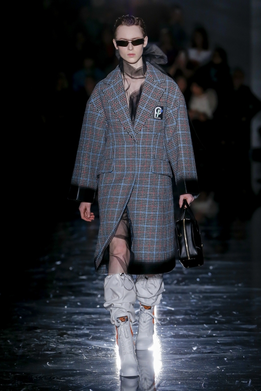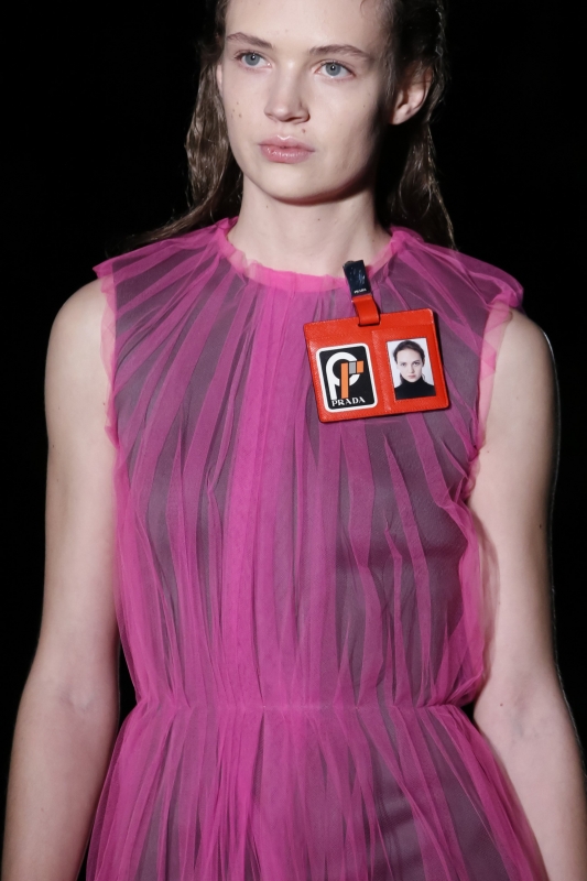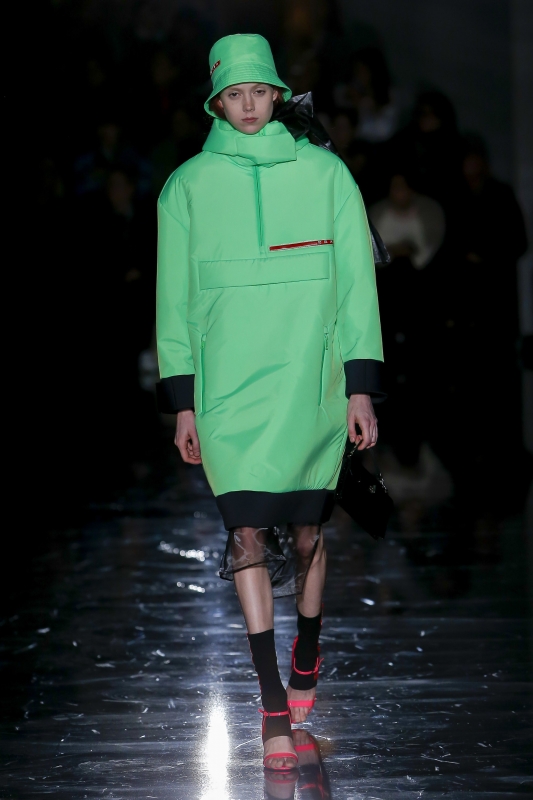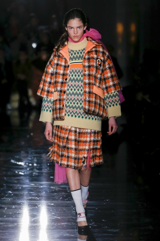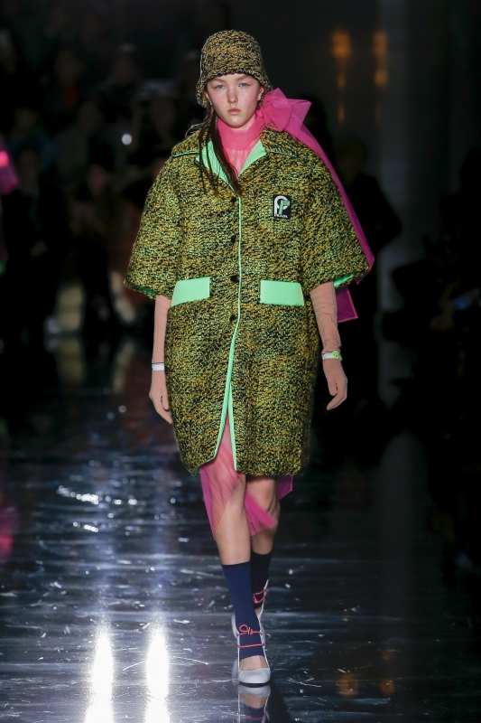 Si l'on adopte par contre le point de vue d'une férue de mode, les choses se compliquent. Il faut dire que le manque de subtilité du DA de chez Gucci commence à devenir problématique. Ne pouvant être une fin en soi, l'accumulation aléatoire d'éléments historico-hétéroclites et l'exagération des volumes (voir ici, ici, ici et là) génèrent ainsi chez le connaisseur une réelle frustration. Mieux agencée et plus finement maîtrisée, la grammaire fourre-tout d'Alessandro Michele pourrait en effet sans mal passer du grotesque au sublime... A l'aune des propos de Miuccia Prada tenus en backstage (à savoir que cette collection constituait sa "petite revanche sur le monde de l'art occupant l'espace artistique"), notre regard sur ses créations à l'esthétique aléatoire se fait plus indulgent. Dans une démarche artistique contestataire, pourquoi ne pas en effet matelasser des vestes normcore, couper des aubes futuristes dans quelques tissus techniques, faire du tulle une matière jouant tour à tour les secondes peaux ou les armures, pousser le féminisme à son paroxysme en livrant des superpositions gommant la silhouette ou encore redonner une chance au fluo ? Cela étant dit, aussi cérébrale soit cette partition, elle n'en recèle pas moins nombre de pièces promises à un beau succès en boutique. Et là est tout le génie de Miuccia Prada. Nul doute en effet que ses longs pull-overs, ses jupes aux impressions numériques et ses manteaux à carreaux aux poignets délimités à la bombe ne manqueront pas de faire le miel des clientes de la griffe.