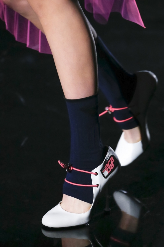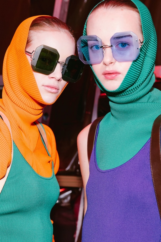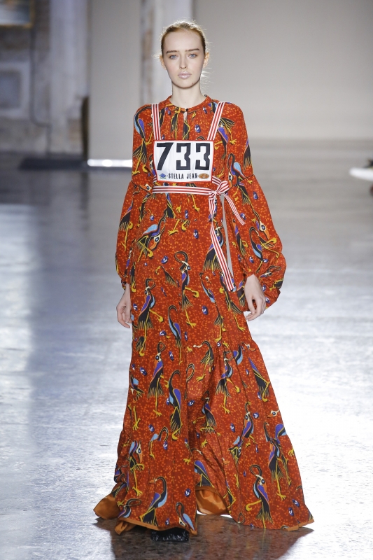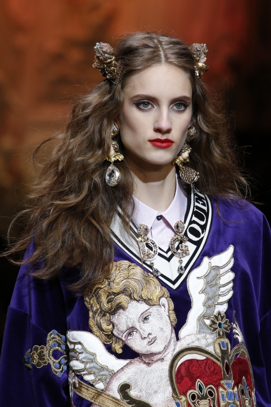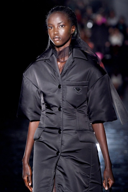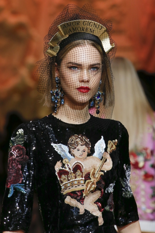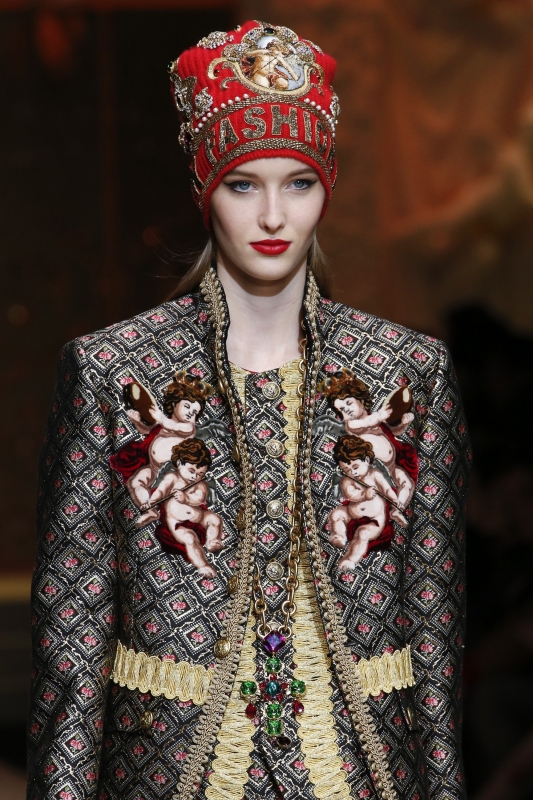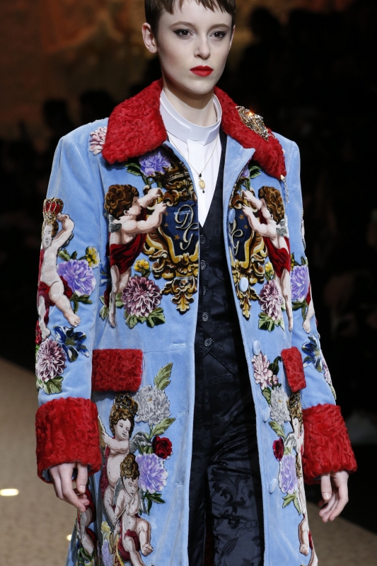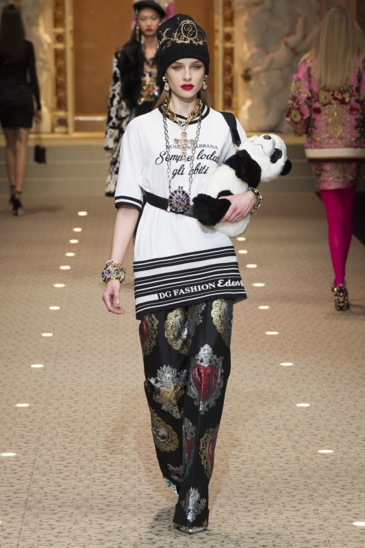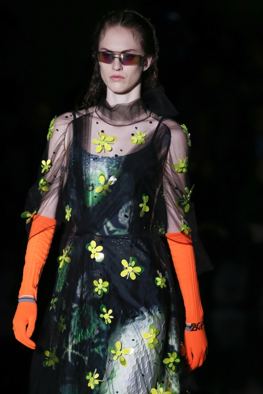Le badge d'identité devient un accessoire trendy à part entière (Prada). Le duo chaussettes/escarpins franchit une ultime frontière en misant sur des chaussettes sans orteils (Prada). Le petit dragon aperçu chez Gucci fait référence à celui créé par l'auteur Allistair Mitchell. On peut légitimement se demander si cette photo de Rick Owens ne serait pas à l'origine des passages les plus terrifiants du show Gucci... Anok Yai est entrée dans l'histoire de la mode contemporaine en étant la première mannequin noire à ouvrir un défilé Prada (voir ici). Chez Dolce&Gabbana, les sacs furent présentés par des modèles d'un nouveau genre : des petits drones aussi fringants que dociles (voir ici). Chez Prada, les chelsea boots s'amourachent des semelles à bulles chères au sportswear afin de se muer en boots de l'espace dopées aux particules de bubble gum (voir ici). Le doudou animalier a le vent en poupe (Dolce&Gabbana, Gucci). Le manteau bi-goût tente une percée (Marni). Chez Moschino, avoir le teint verdâtre n'est pas un problème (voir ici). Avec ou sans connotation religieuse, le foulard (ou cagoule) s'invite sur bon nombre de shows (Versace, Max Mara, Max Mara Atelier, Gucci, Marni). Le manteau XXL à fleurs oversize de chez Jil Sander et la jupe Sailor Moon vue chez Pucci risquent de séduire moult fashionistas. Pour faire briller son catwalk, Angela Missoni n'a pas hésité à inonder le sol de l'entrepôt où se déroule son défilé (voir ici).