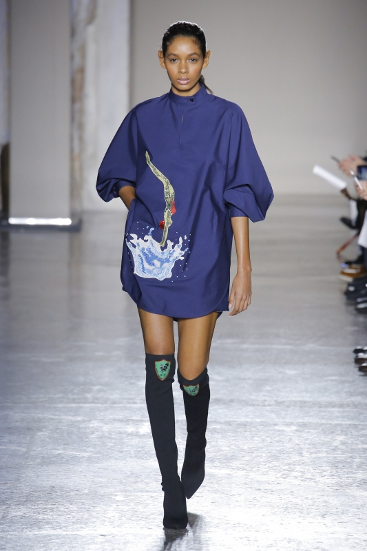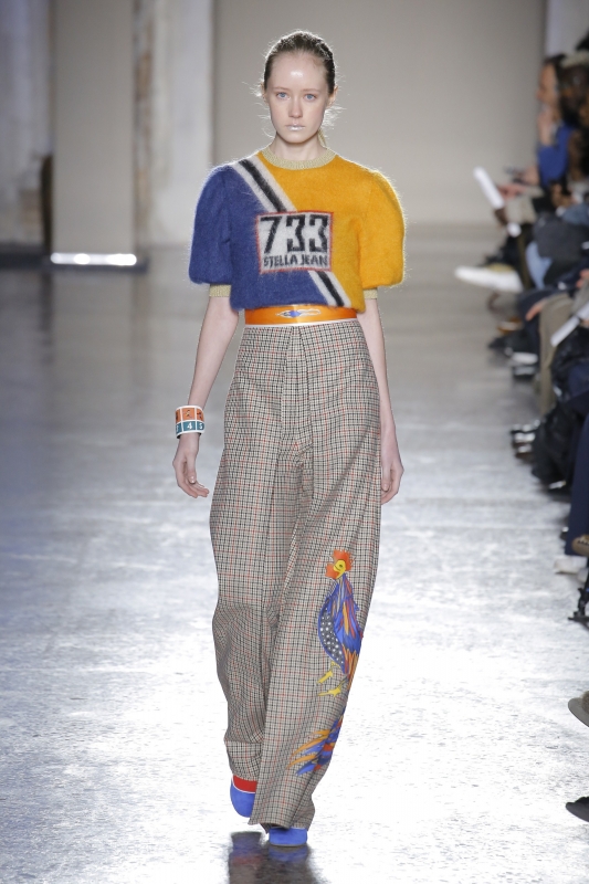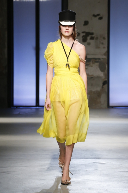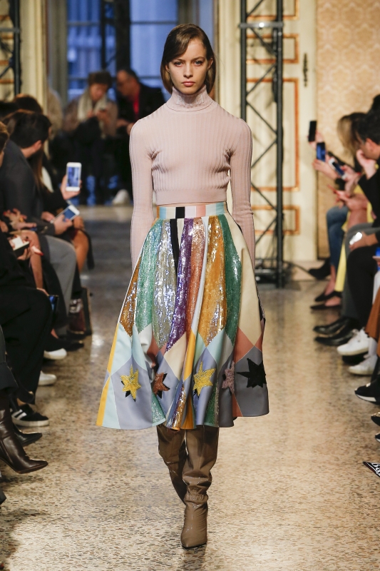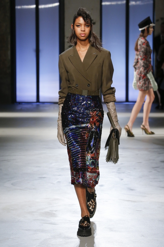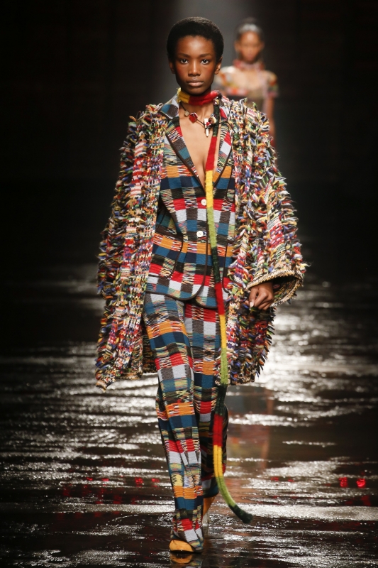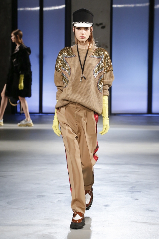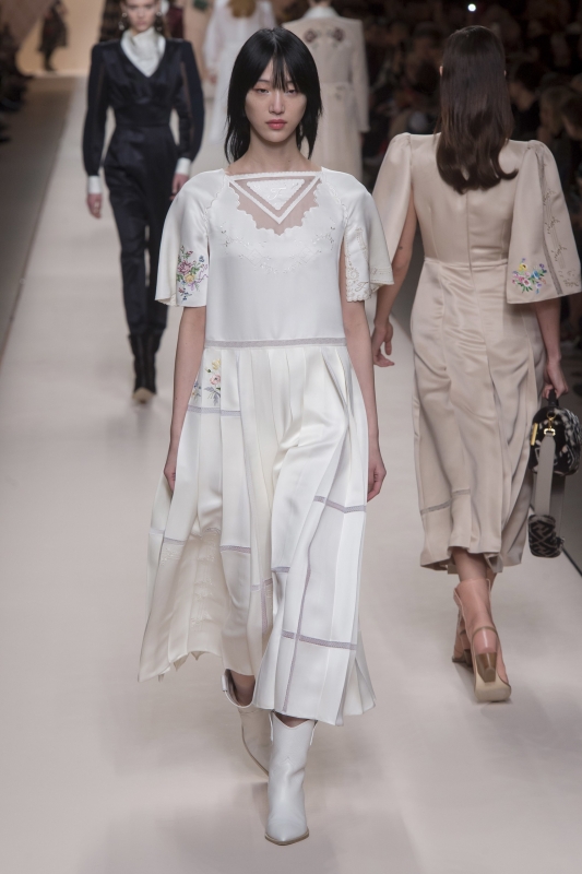 Si Karl Lagerfeld et Silvia Venturi Fendi succombent cette saison à la logomania en proposant des pièces all-over destinées à la jeunesse dorée asiatique, ils n'en livrent pas moins un vestiaire futuro-contemporain riche en toilettes powerful. Avec ses allures de Sean Young (Blade Runner) et ses santiags revisitées, la femme Fendi se fait en effet plus puissante que jamais. Une force qu'elle gomme cependant dans l'intimité en se glissant dans des robes candides qui risquent fort de faire le miel des acheteurs. A en juger par le nombre d'angelots présents sur les créations Dolce&Gabbana (voir ici, ici, ici, ici, ici et là), nul doute que les invitées au prochain bal du Met - dont le thème est "Corps célestes : Mode et imagerie catholique" - iront dénicher leur tenue chez la griffe italienne. Chez Marni, à défaut d'être subjugué par les accumulations pour festivaliers altermondialistes de Francesco Risso (voir ici et là), on salue ses expérimentations textiles basées sur des matières recyclées (voir ici et là). Stella Jean s'empare de l'univers du sport et le décline de manière peu subtile au sein de sa collection de saison (voir ici, ici et là). À l'avenir, la créatrice gagnerait à se concentrer sur ce qu'elle sait faire de mieux, à savoir fusionner coupe occidentale et imprimés esprit Wax. Chez Philosophy, Lorenzo Serafini nous livre quelques astuces pour "upgrader" la combinaison-pantalon. On retiendra ainsi qu'il est bon de ceinturer taille haute cette dernière et d'y glisser une blouse volantée dont on laissera apparaître le col et les poignets. De même, il ne faudra pas hésiter à casser l'ADN casual de ladite combinaison en la réchauffant au creux d'un opulent manteau en fausse fourrure. Créatif tout en restant portable et attractif, le travail d'Alessandro Dell'Acqua brille par sa précision et son audace maîtrisée. On salue ainsi la coupe parfaite des pantalons, la savante opposition entre manches ballons et bretelles basculées, l'insertion de sequins sur des volumes tantôt opulents, tantôt stricts, mais aussi la superposition carreaux/voile brodé (voir ici et là).