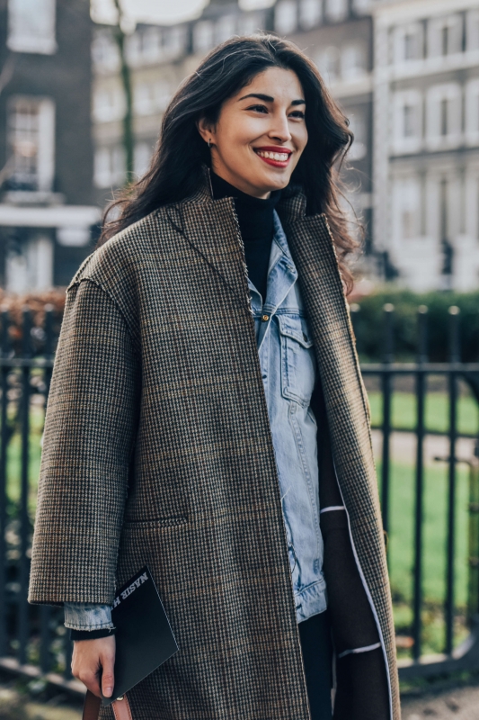 veste en jean délavé + manteau masculin à carreaux + rouge à lèvres glam et crinière lâchée https://www.tendances-de-mode.com/images/upload/15...