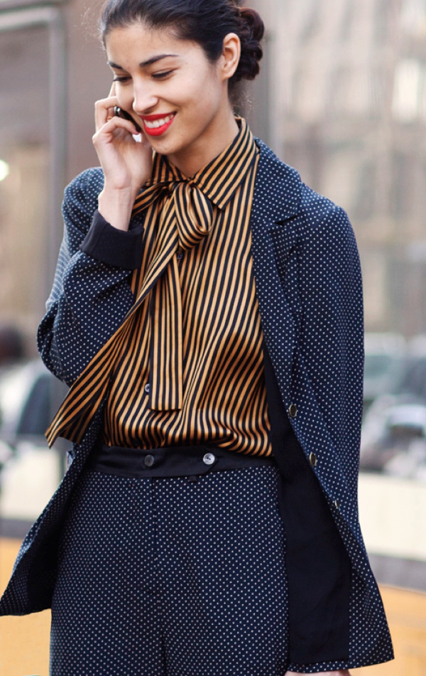ou alors tailleur marine à petits pois + chemise rayée ocre et noir + rouge vibrant et chignon https://www.tendances-de-mode.com/images/upload/15...